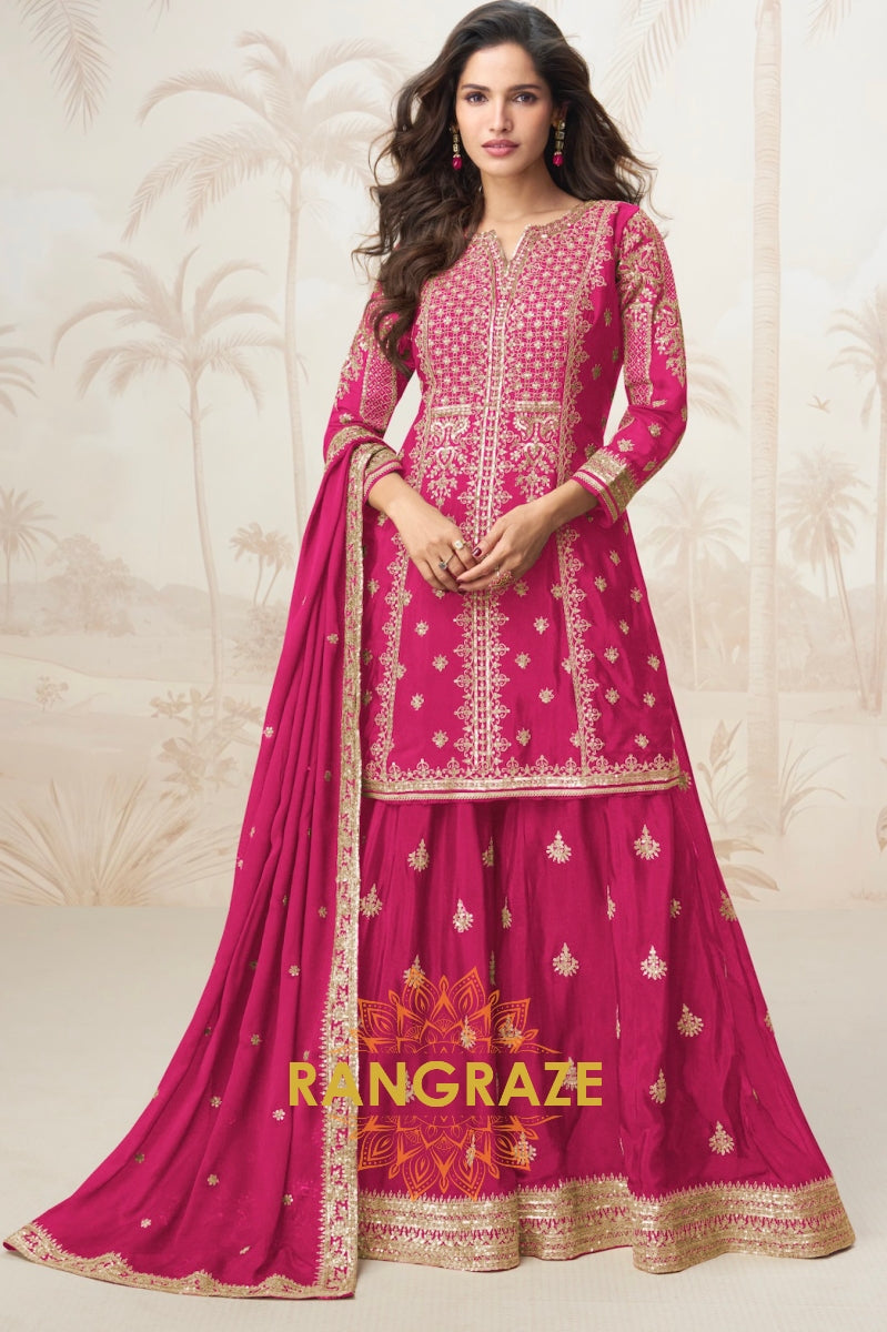 Fuchsia Flame Silk Embroidered Sharara Suit Set – Radiant, Festive & Feminine