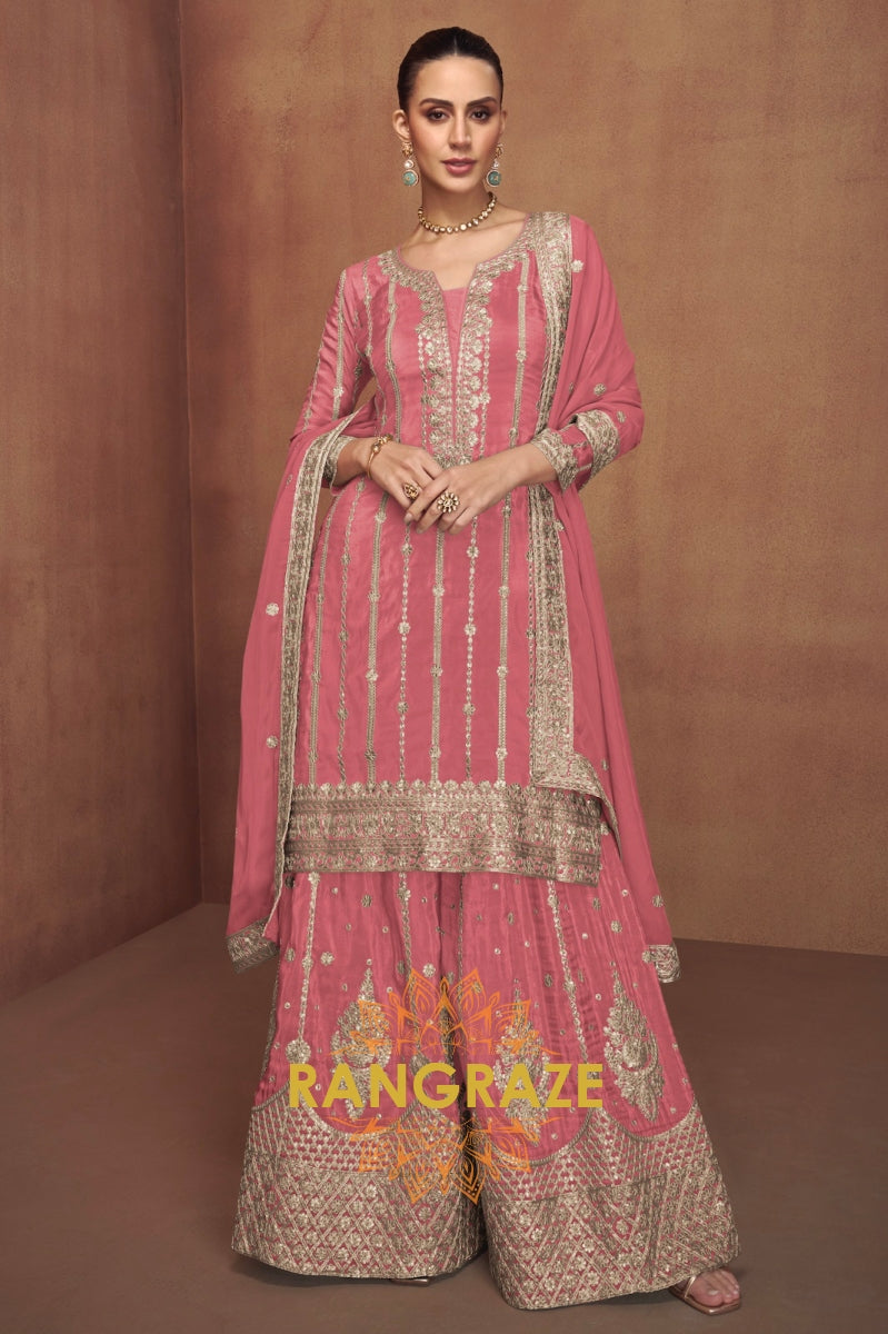 Step into timeless elegance with this Rani Pink Embroidered Chinon Silk Palazzo Set, a captivating...