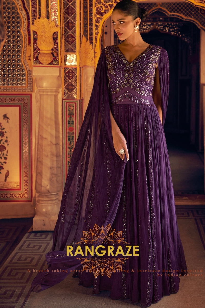 Regal Plum Embellished Georgette Gown Suit Set
