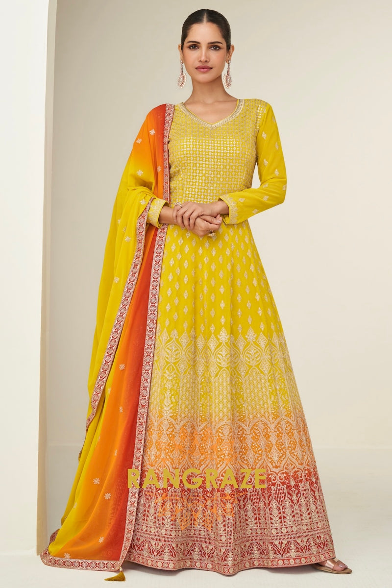 Sunshine Yellow Ombre Georgette Anarkali Gown Suit with Dupatta