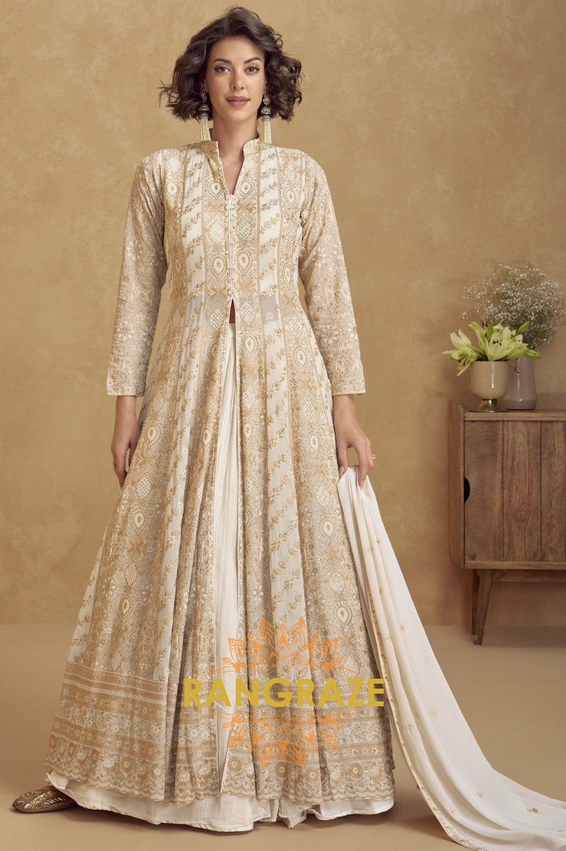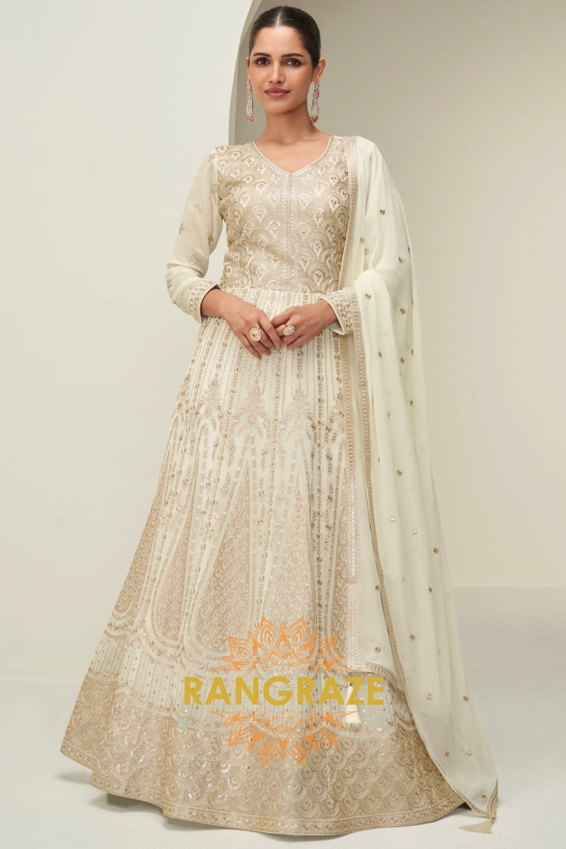 Ivory Gold Embroidered Georgette Anarkali Gown Suit Set