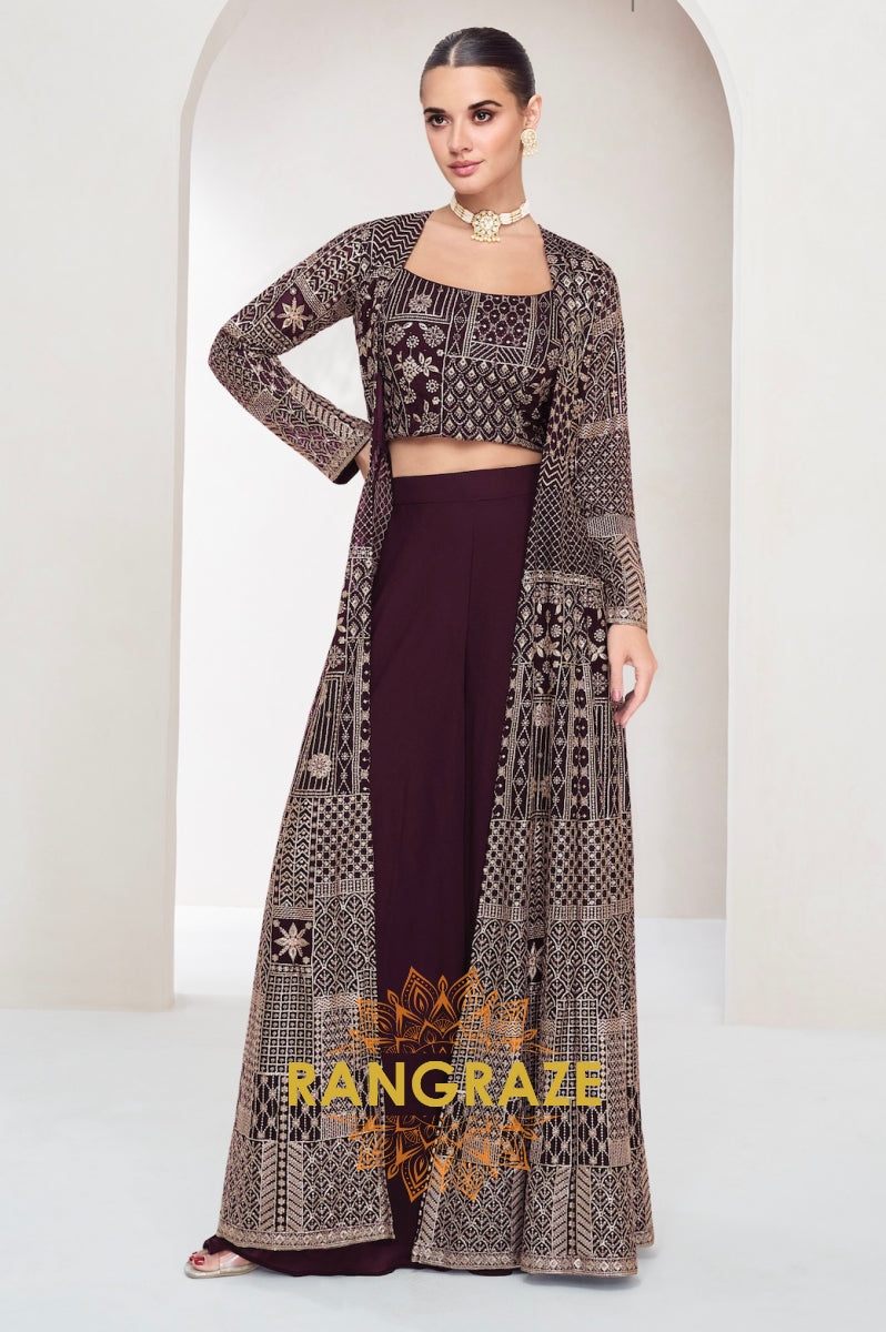 Wine Regal Embroidered Indo-Western Palazzo Suit Set