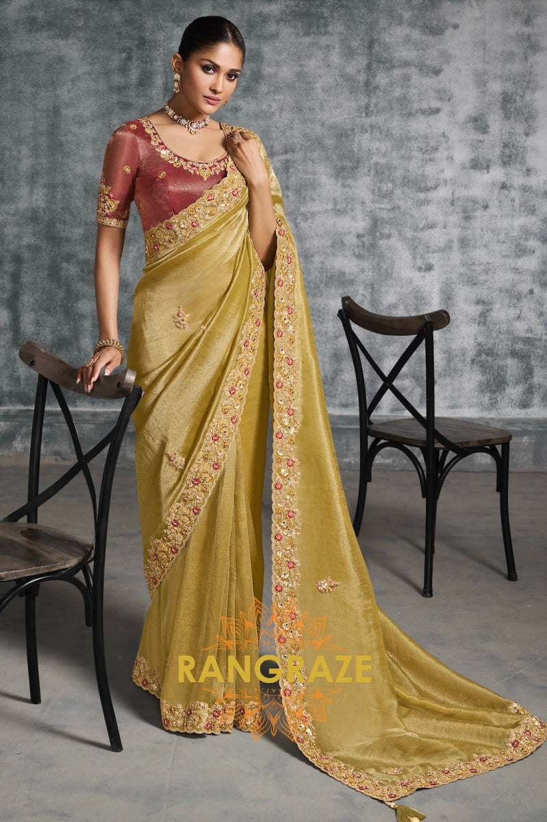 Olive Grandeur: Designer Embroidered Tissue Silk Bridal Saree