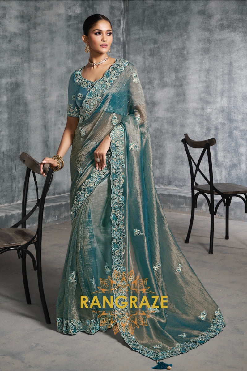 Teal Blue Premium Tissue Zari Saree with Intricate Embroidery