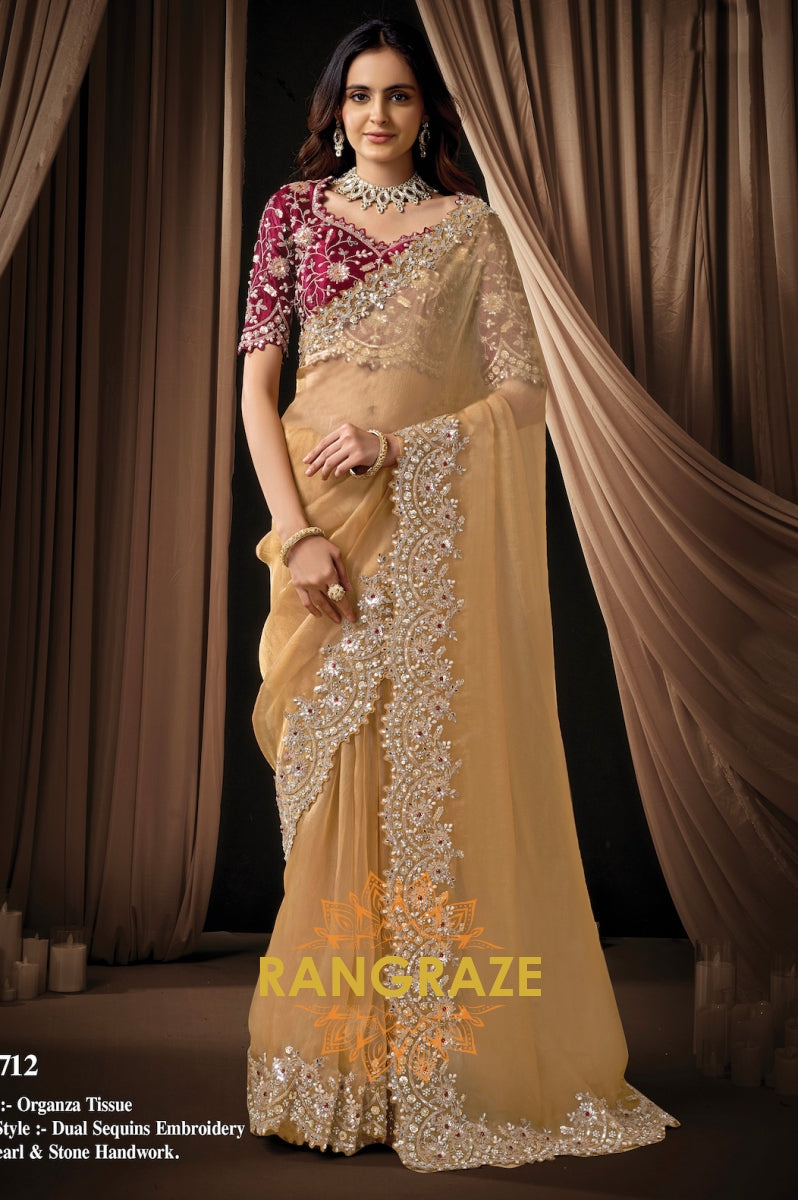 Gold Organza Tissue Sequins Embroidered Saree with Designer Blouse