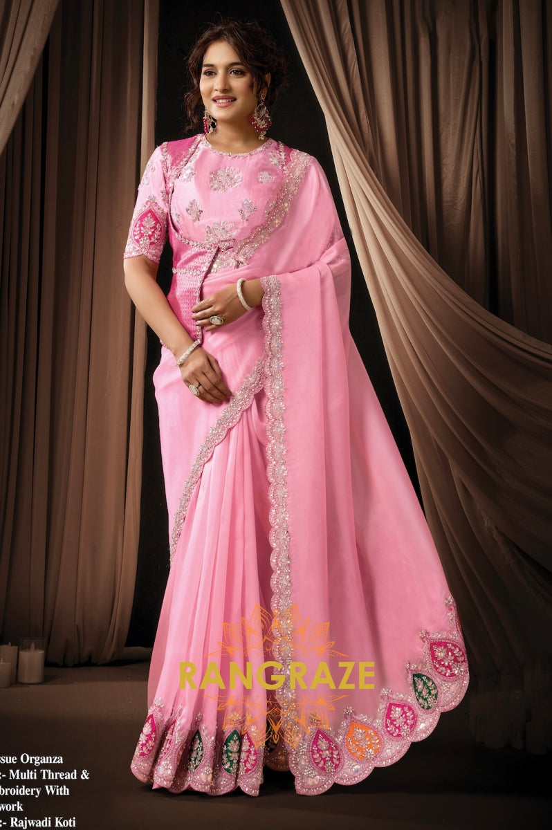 Pink Tissue Organza Embroidered Saree with Rajwada Koti
