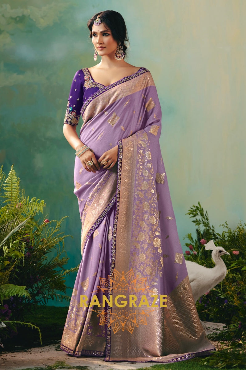 Lavender Silk Saree with Zari Weaving and Royal Purple Embroidered Blouse