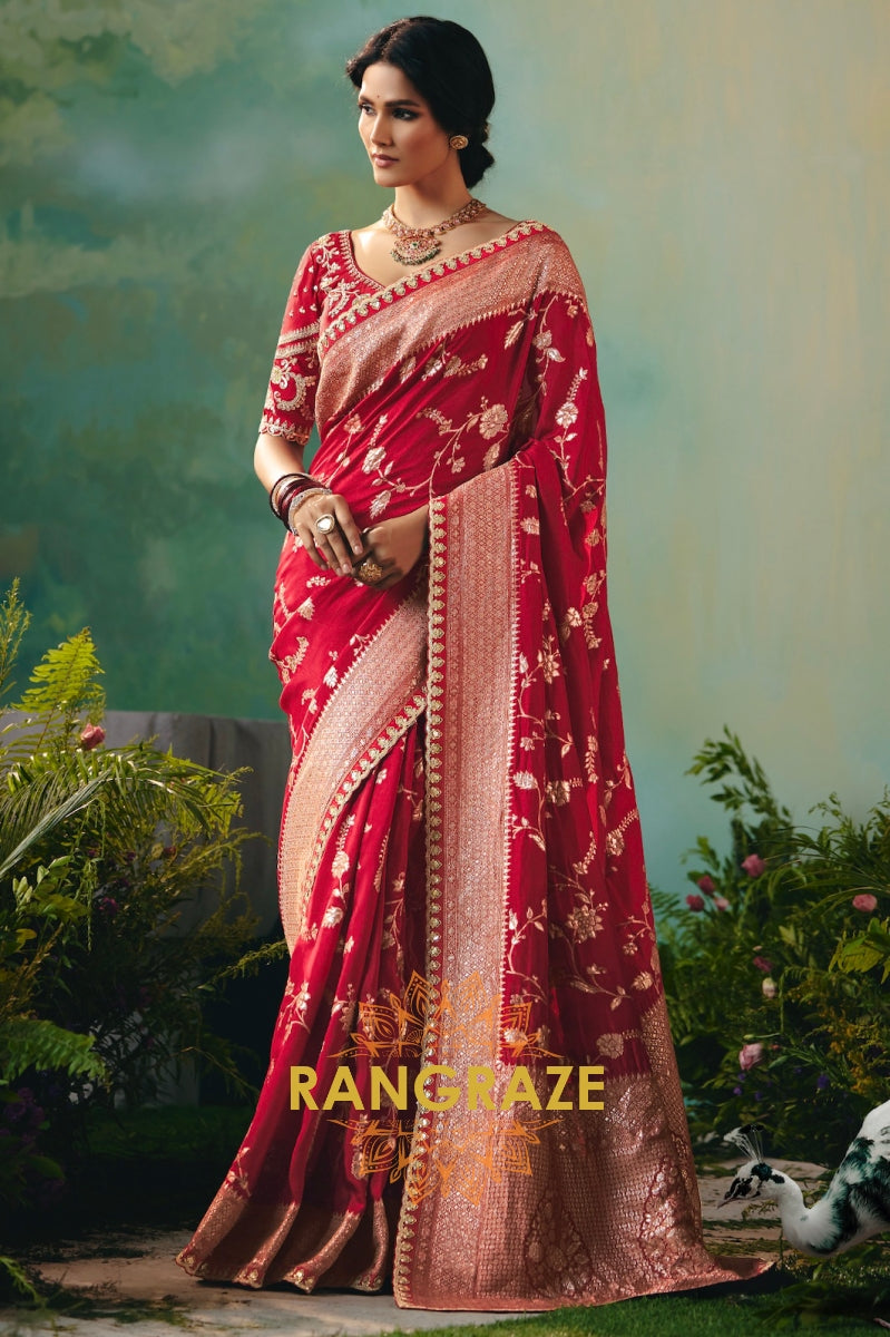 Crimson Red Silk Saree with Zari Floral Weaving and Embroidered Blouse