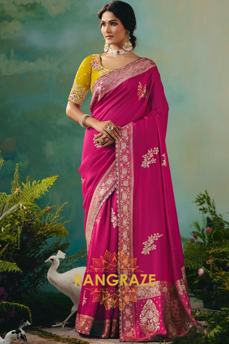 Radiant Fuchsia Silk Saree with Zari Weaving & Floral Embroidered Contrast Blouse