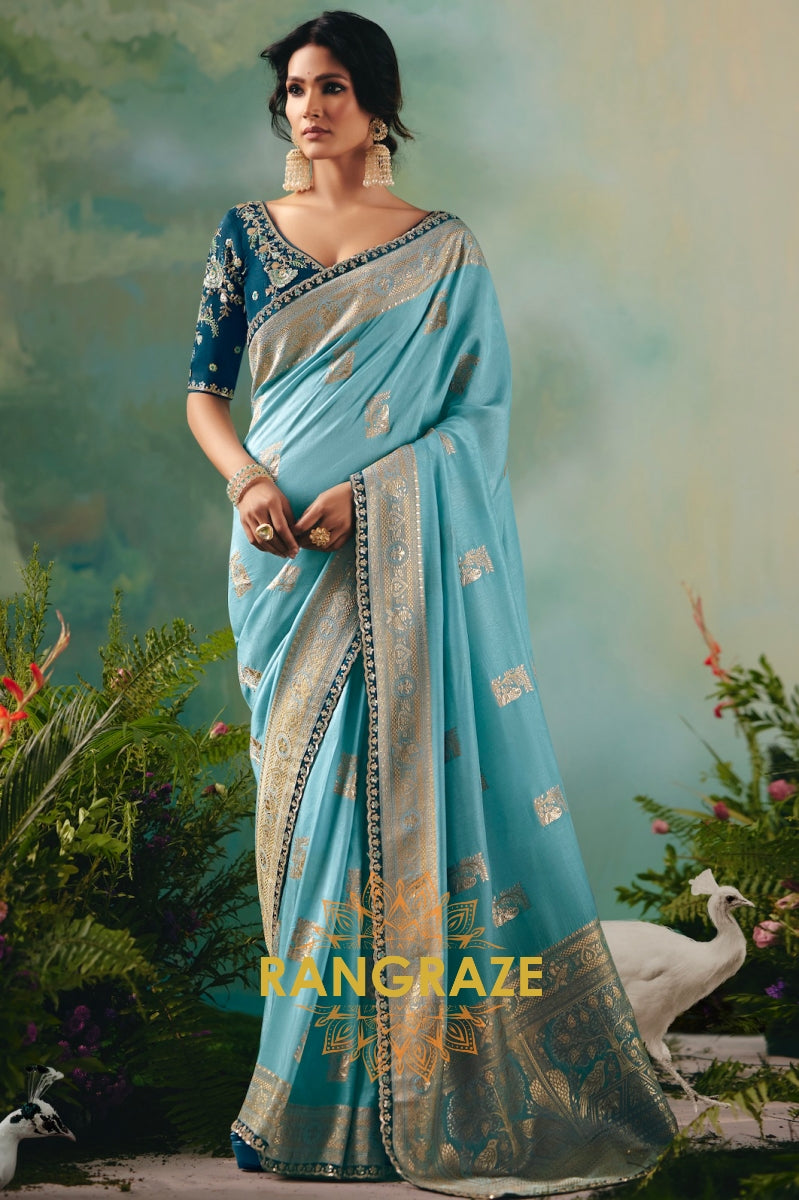 Azure Bloom Silk Saree with Zari Weaving & Embroidered Contrast Blouse