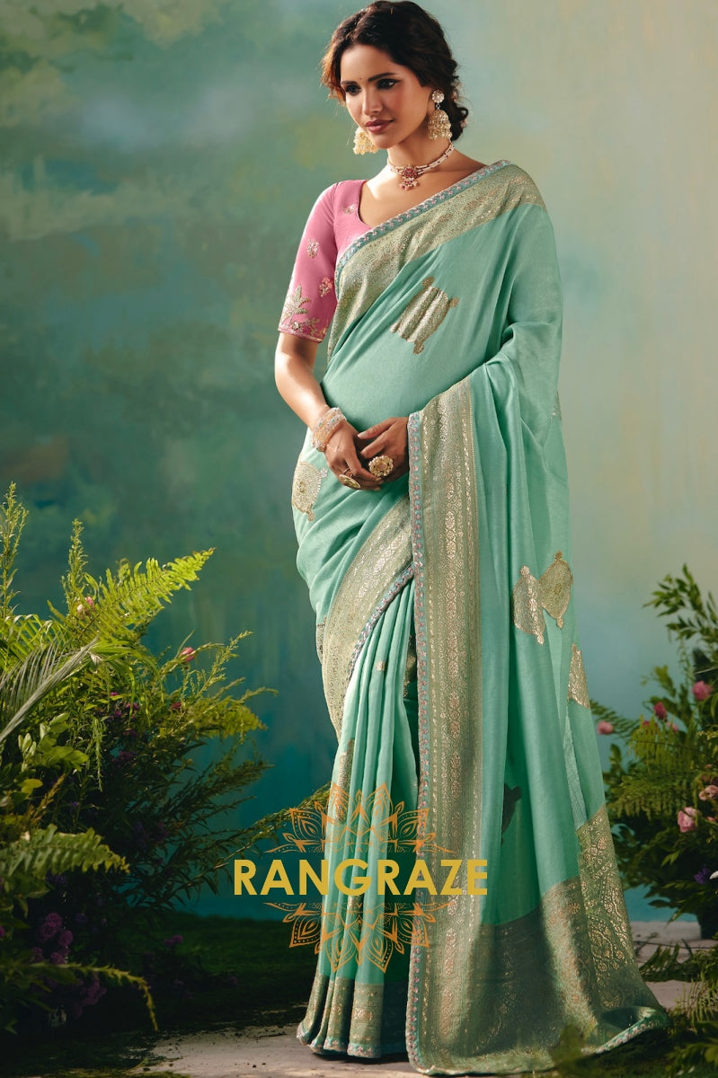 Mint Green Silk Saree with Zari Weaving and Pink Embroidered Blouse