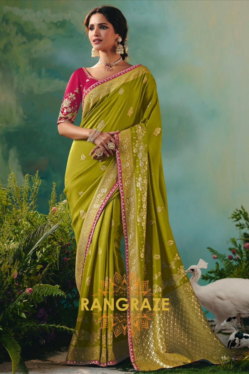 Olive Green Silk Saree with Zari Weaving and Magenta Embroidered Blouse