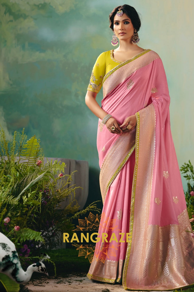 Baby Pink Silk Saree with Zari Weaving and Mustard Embroidered Blouse