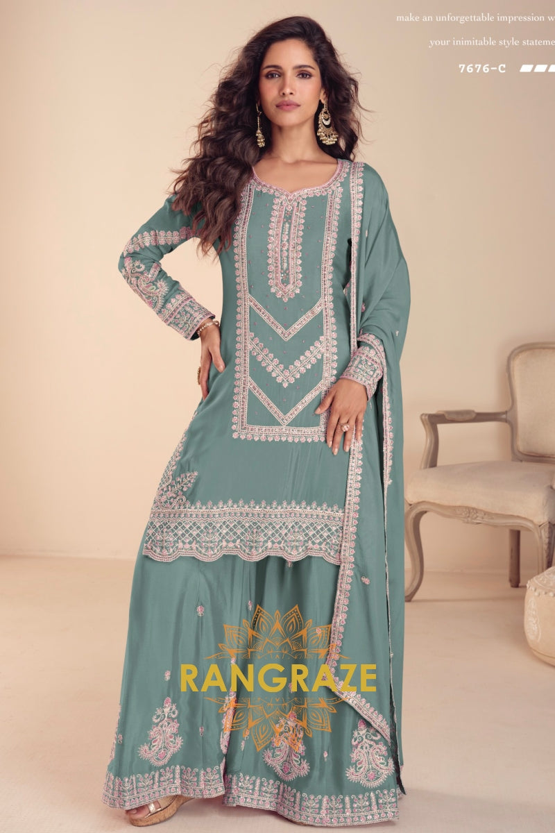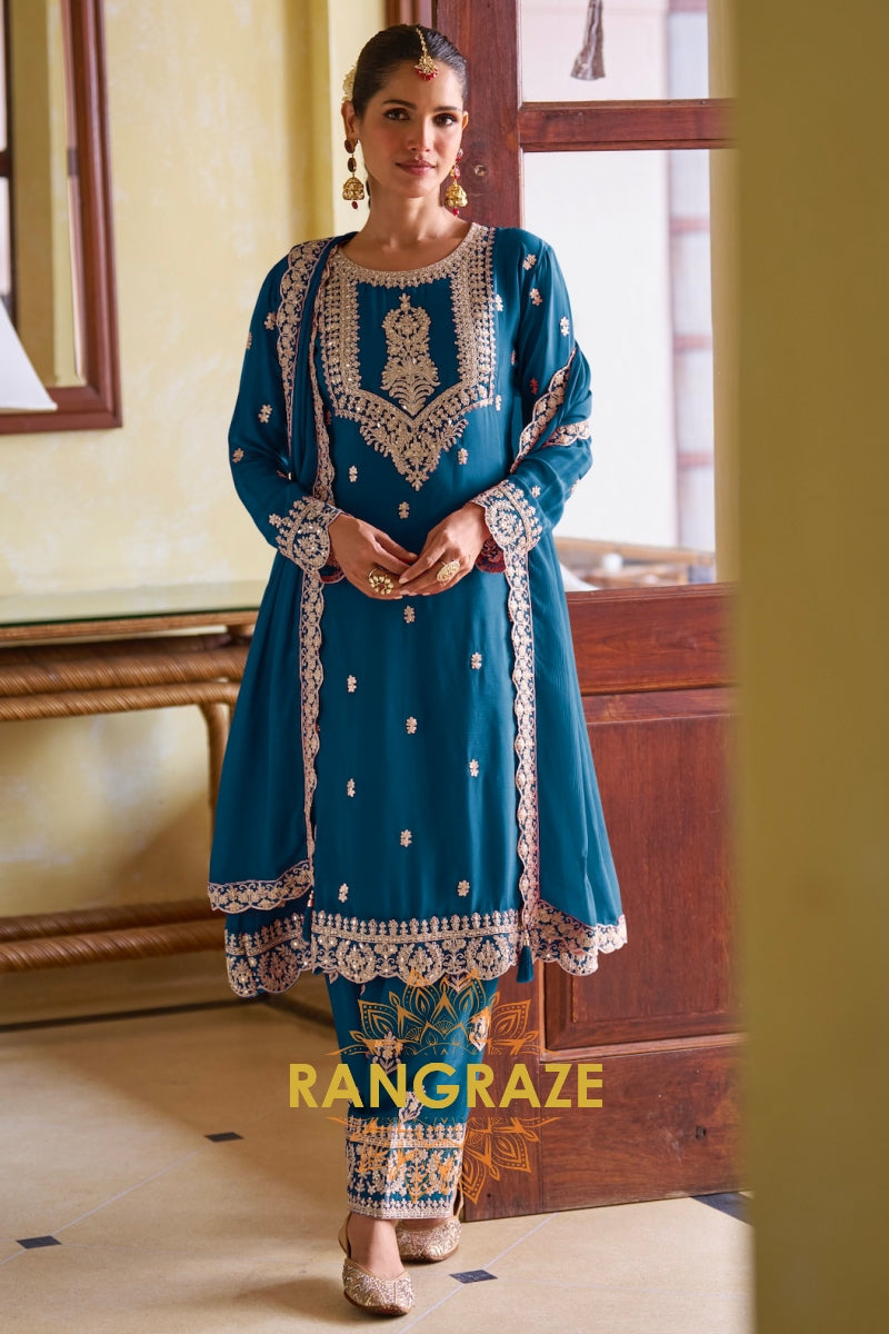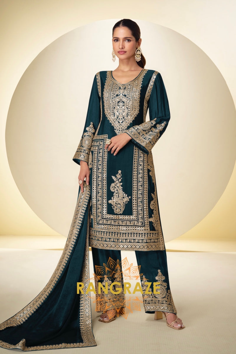 Teal Premium Chinon Designer Embroidered Suit Set