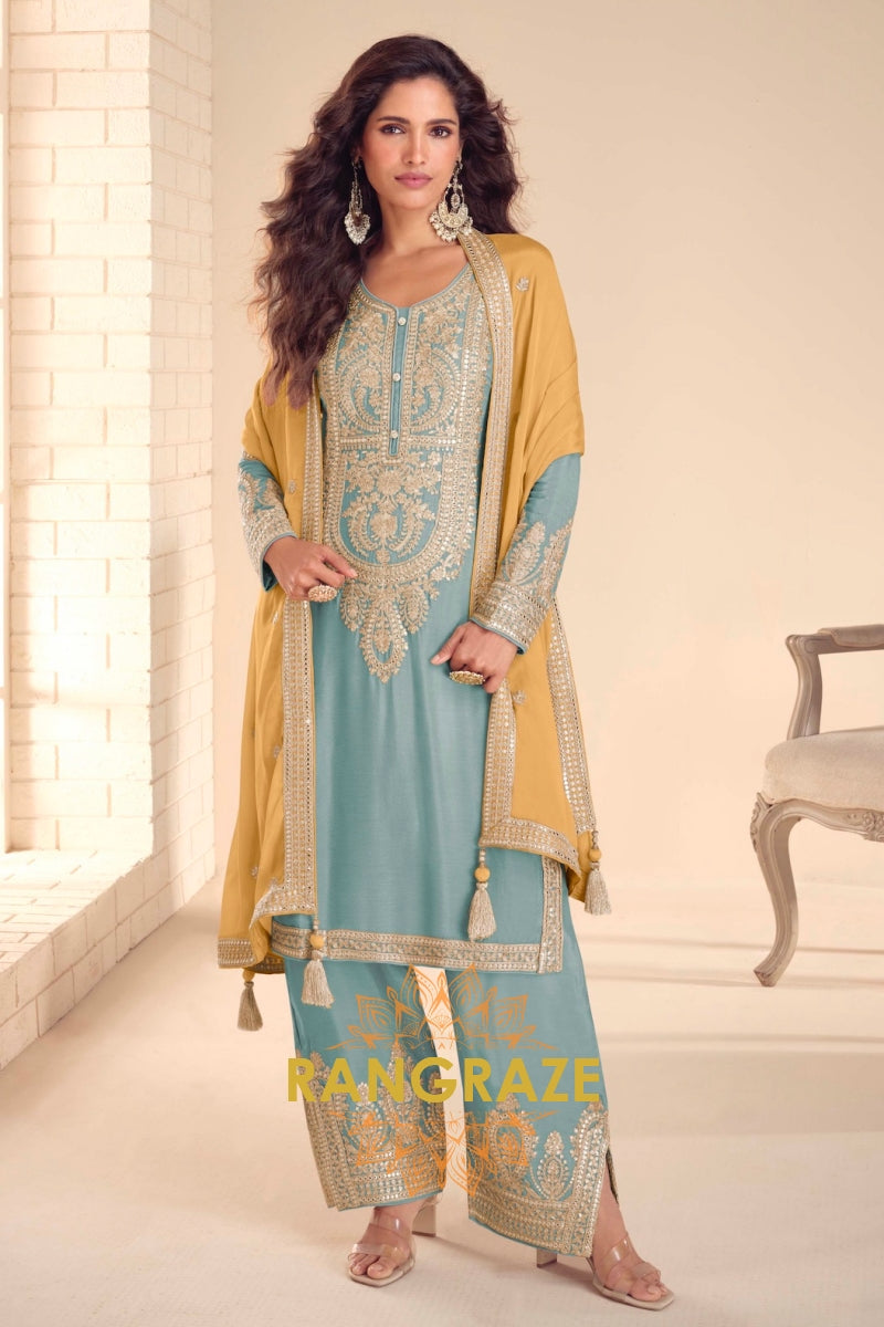 Powder Blue Premium Chinon Designer Suit Set