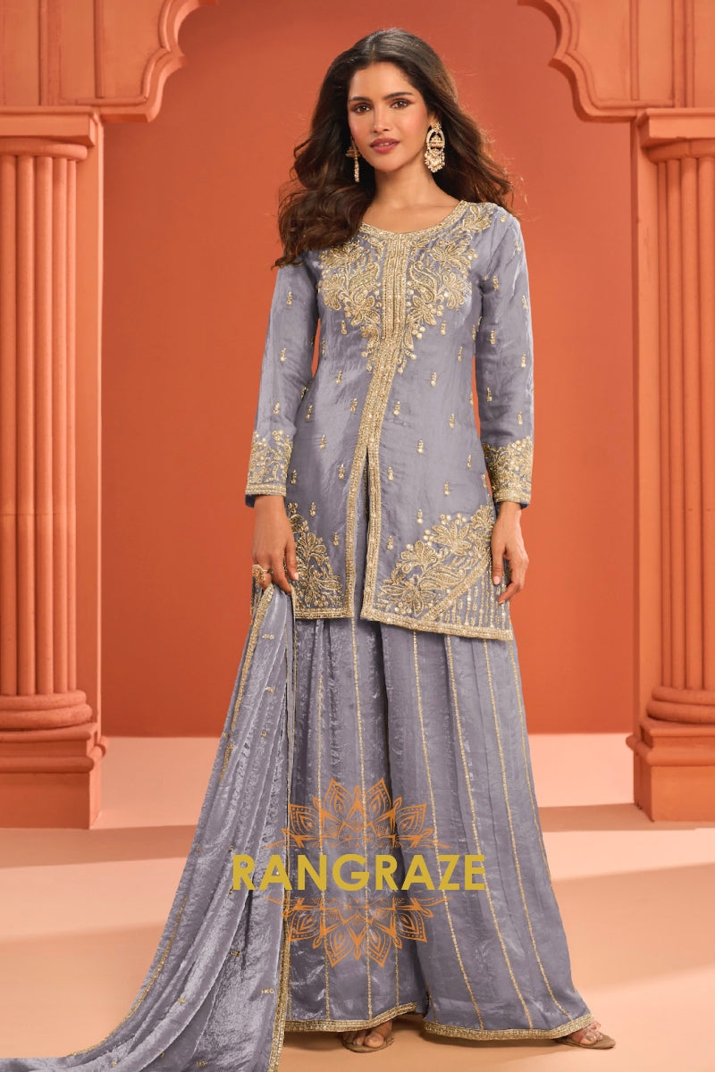 Grey Silk Designer Embroidered Suit Set