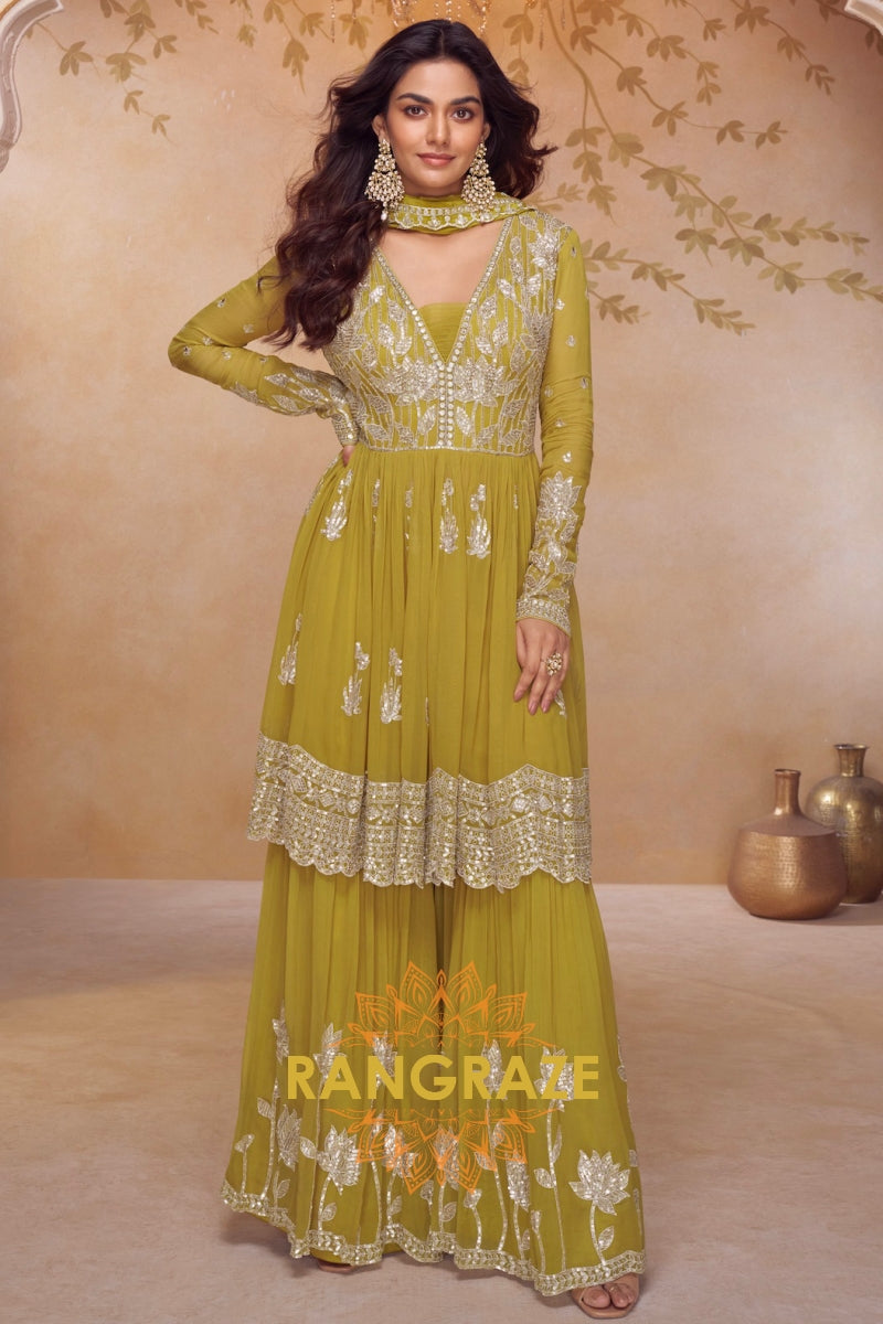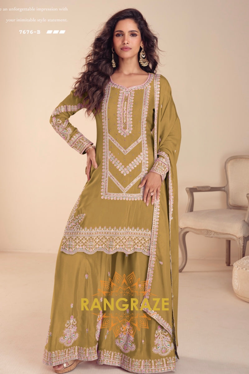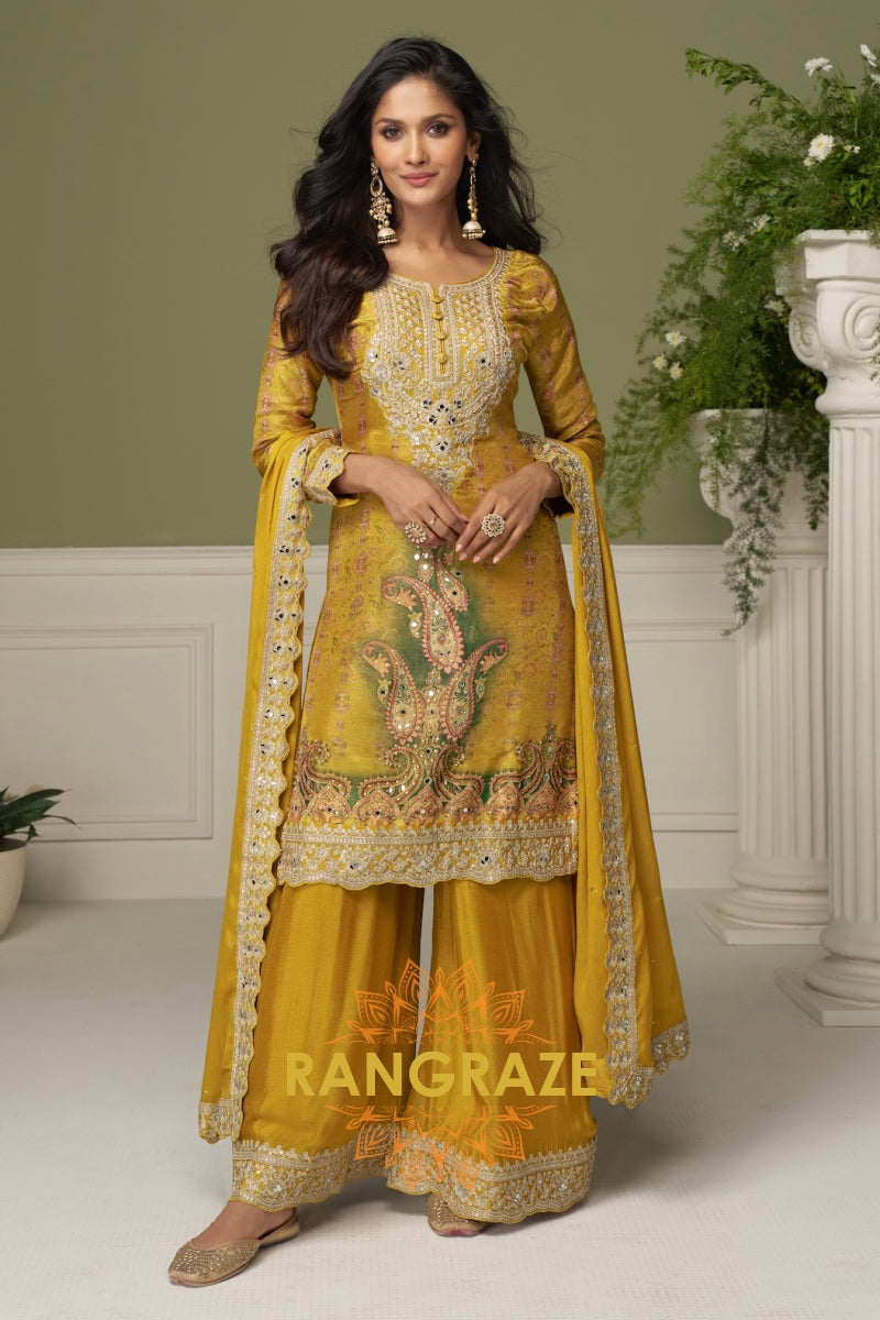 Mustard Premium Chinon Designer Suit Set