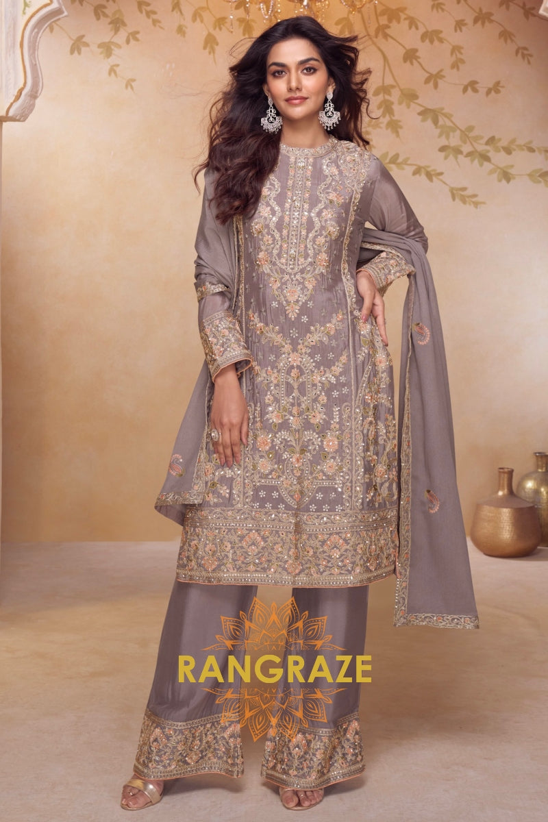 Taupe Premium Chinon Designer Embroidered Suit Set