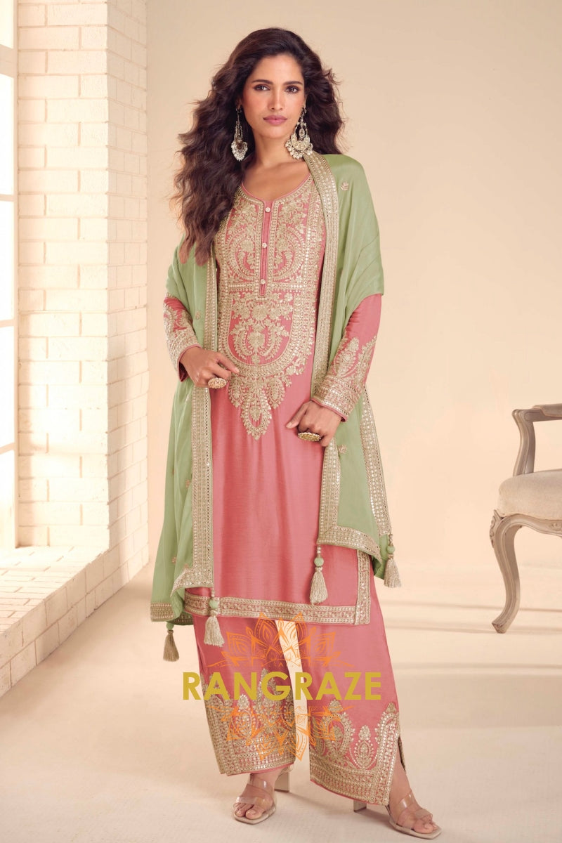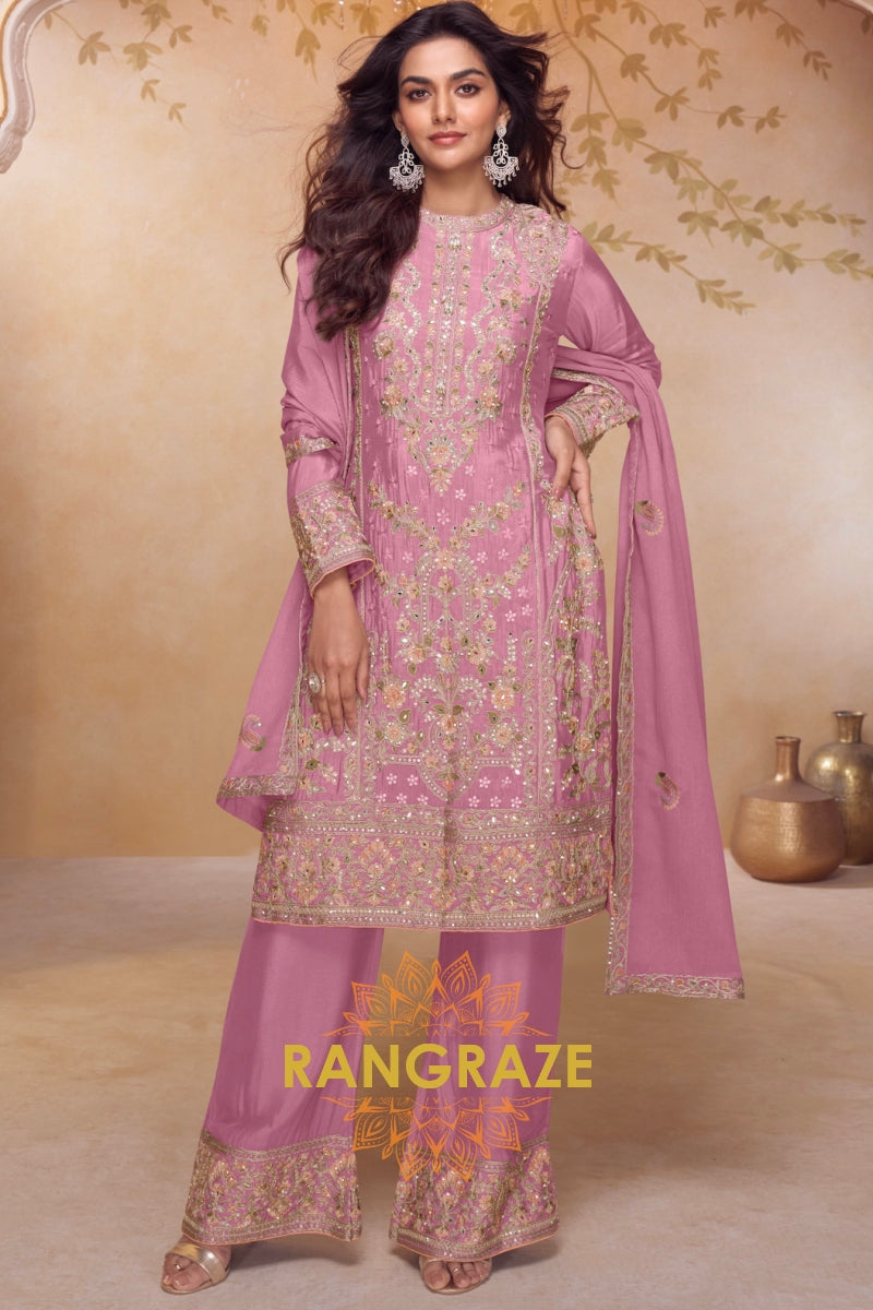 Rose Pink Premium Chinon Designer Suit Set
