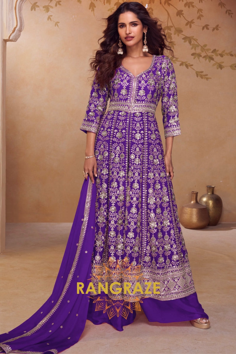 Royal Purple Premium Chinon Designer Anarkali Suit Set
