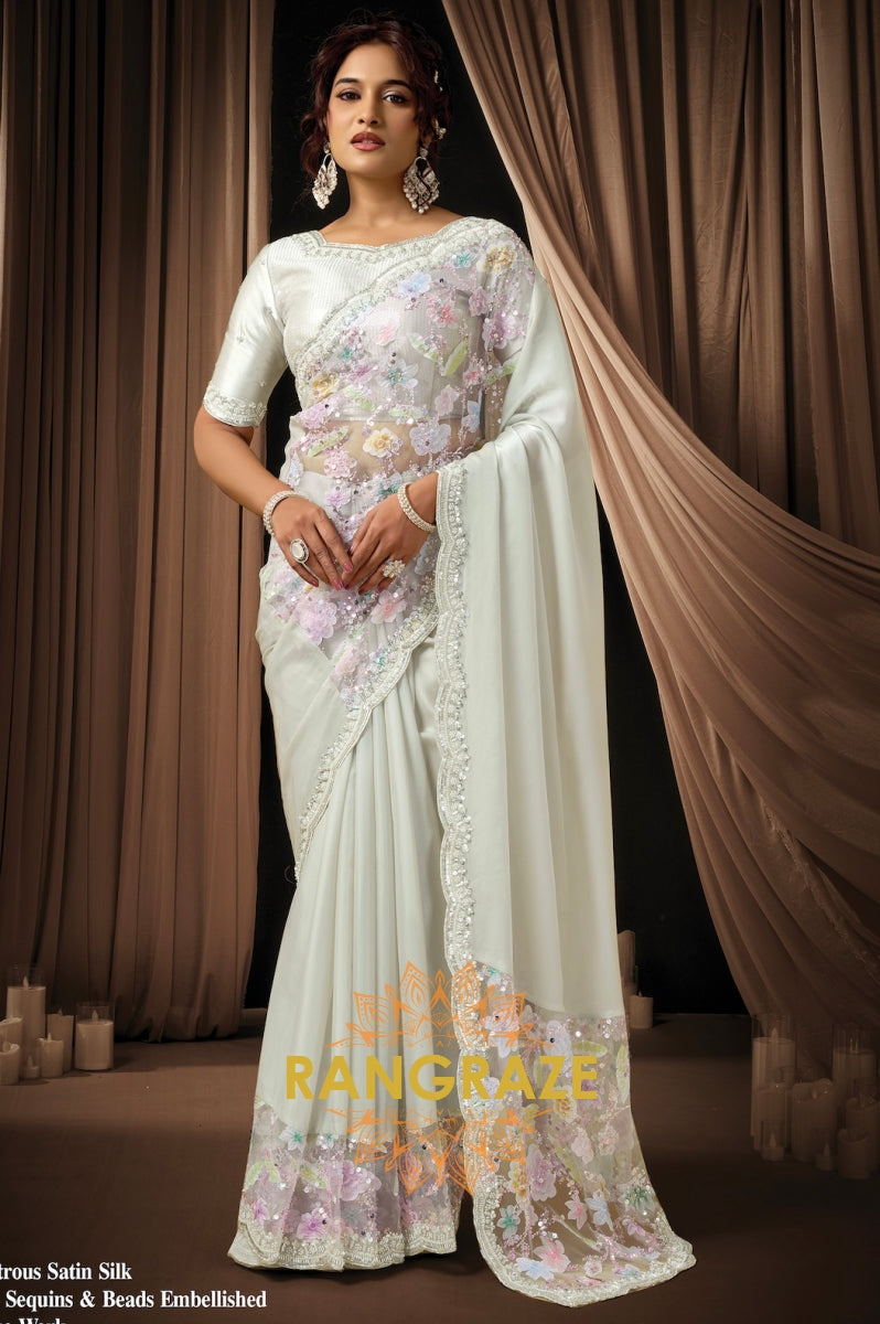 Silver Grey Satin Silk Oval Sequins Embroidered Saree with Designer Blouse