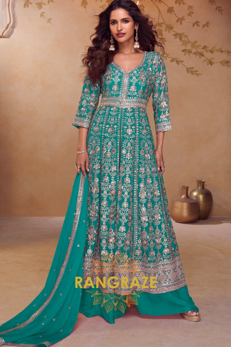 Emerald Teal Premium Chinon Embroidered Designer Suit Set