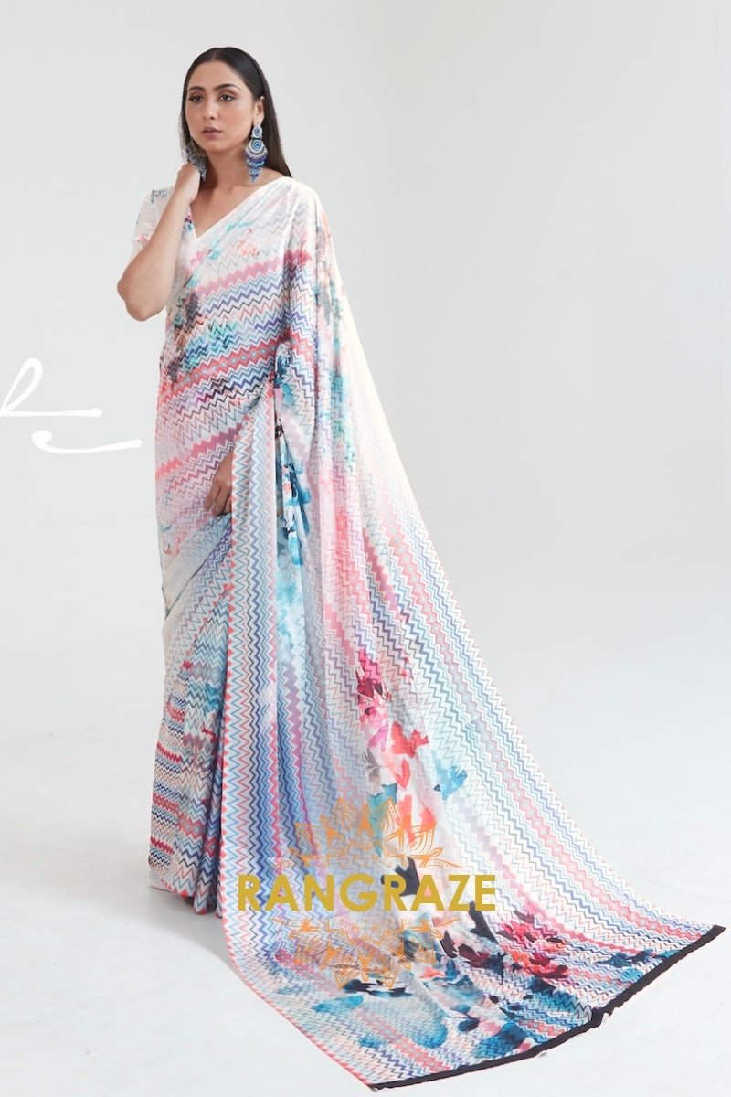 Daisy White Multi Color Abstract Printed Crepe Silk Saree