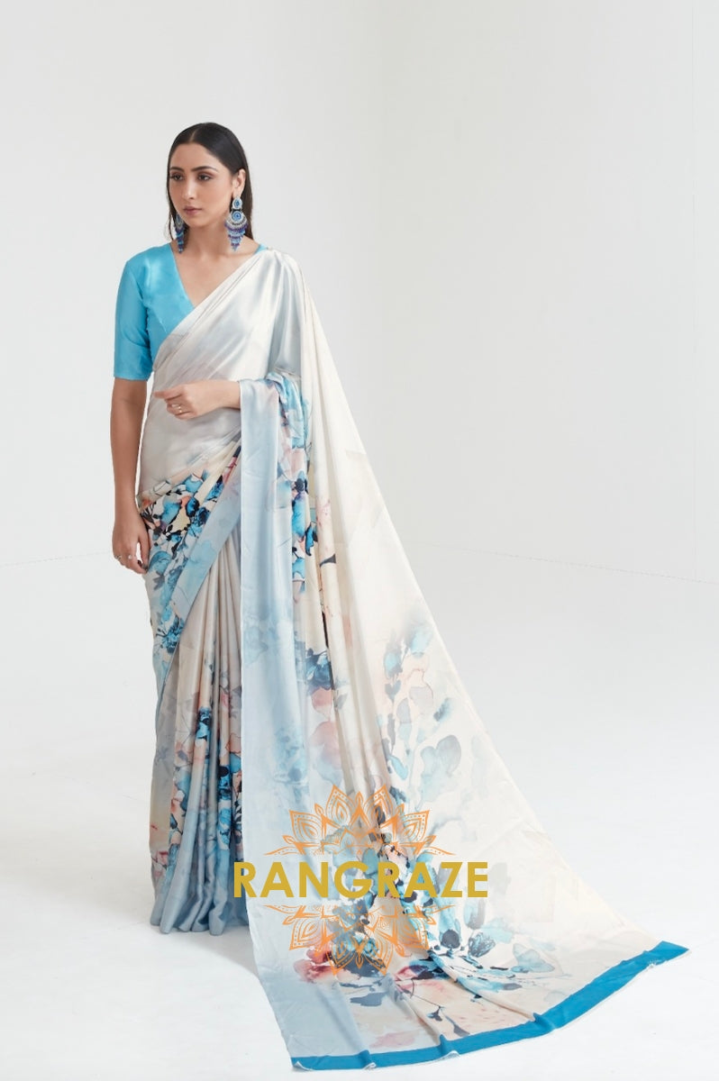 Beige Radiant Blue Satin Silk Printed Saree