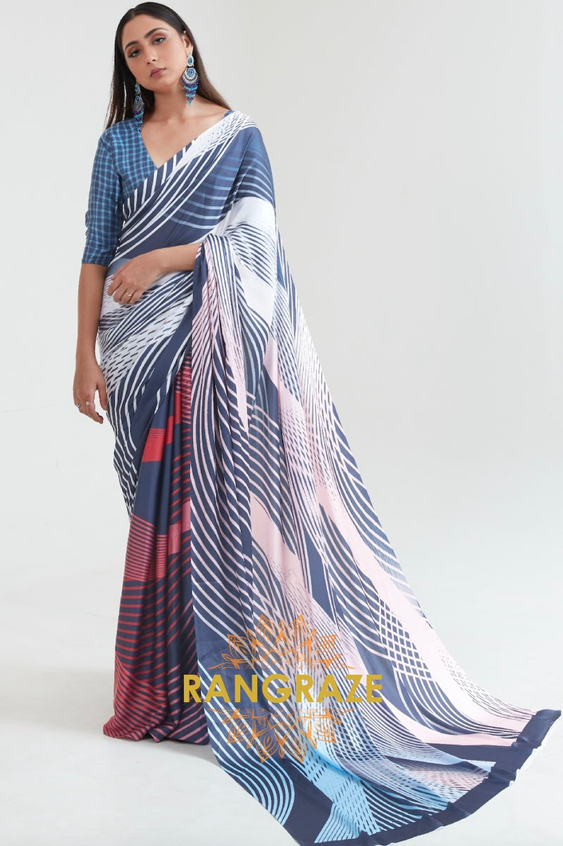 Blue And White Strip Printed Crepe Silk Saree