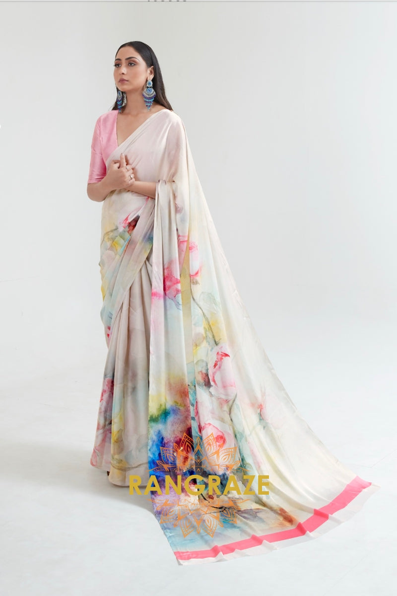 White Radiance Digital Print Satin Silk Saree