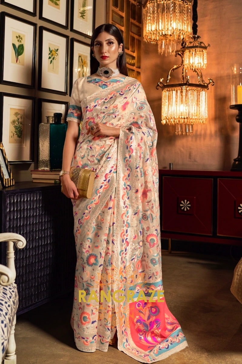 Pearl White Kashmiri Silk Jamewar Saree With Multi Color Weaving