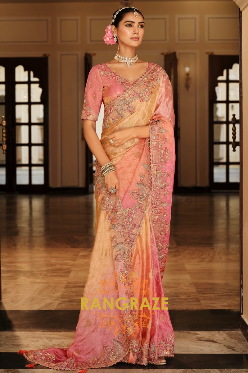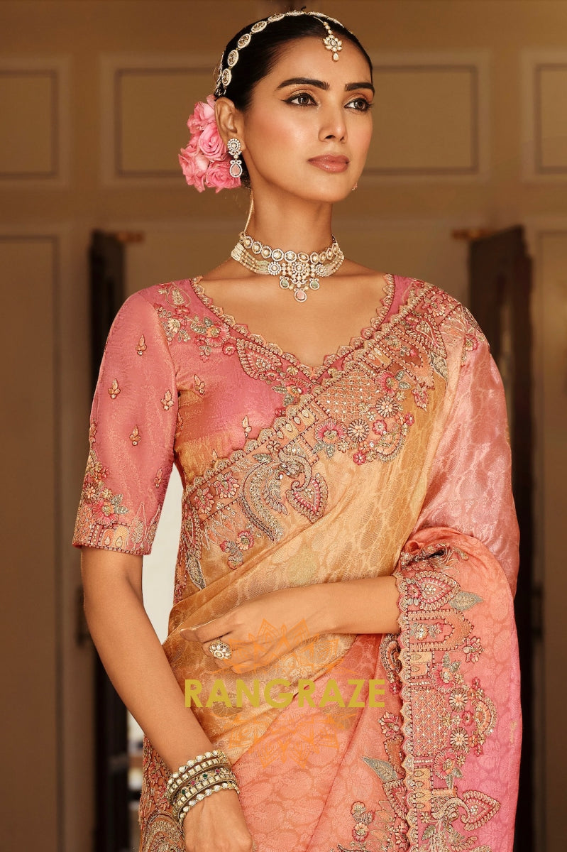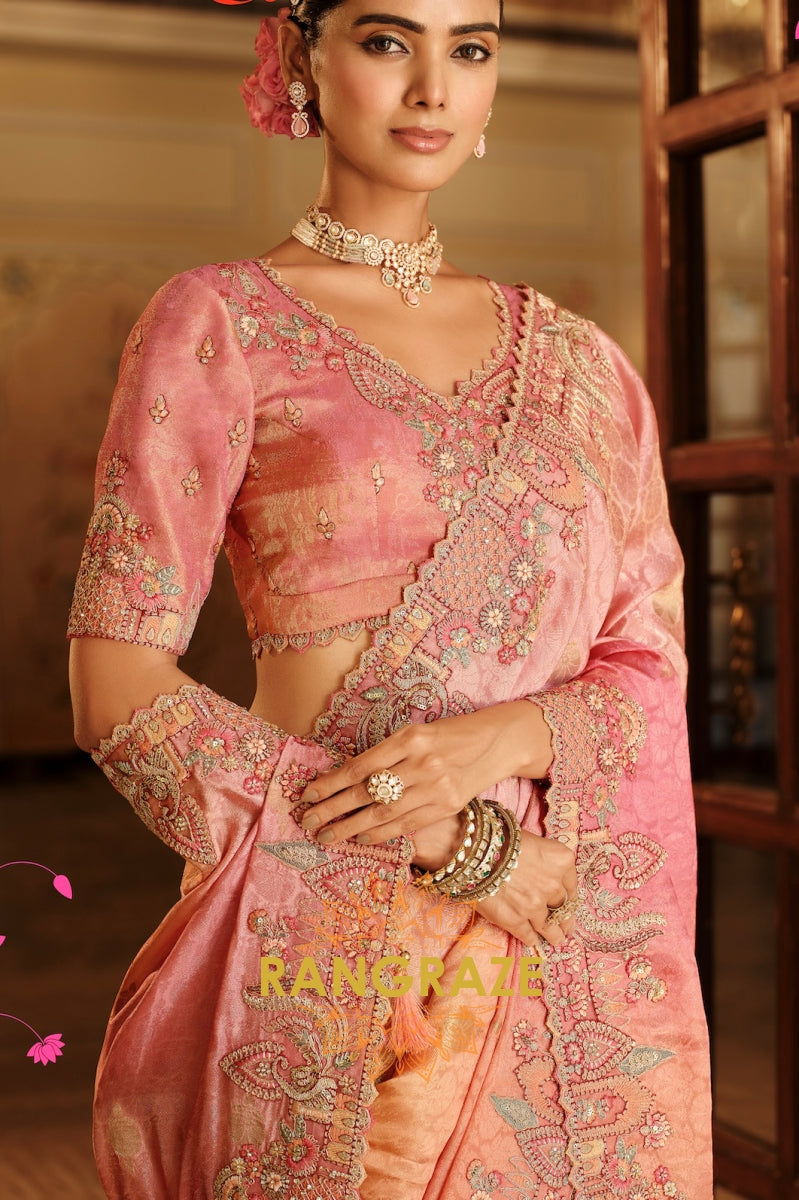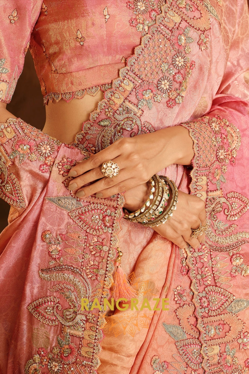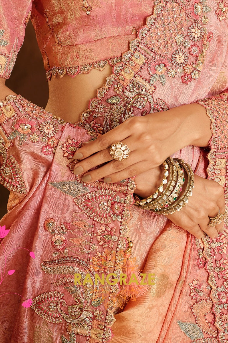 Immerse yourself in the radiance of tradition with the Blush Peach Elegance Designer Embroidered Silk Saree. This exquisite drape, in a captivating blend of peach and soft pink hues, is adorned with intricate embroidery featuring floral motifs, sequins, and shimmering threadwork that exude timeless charm.