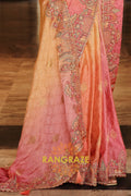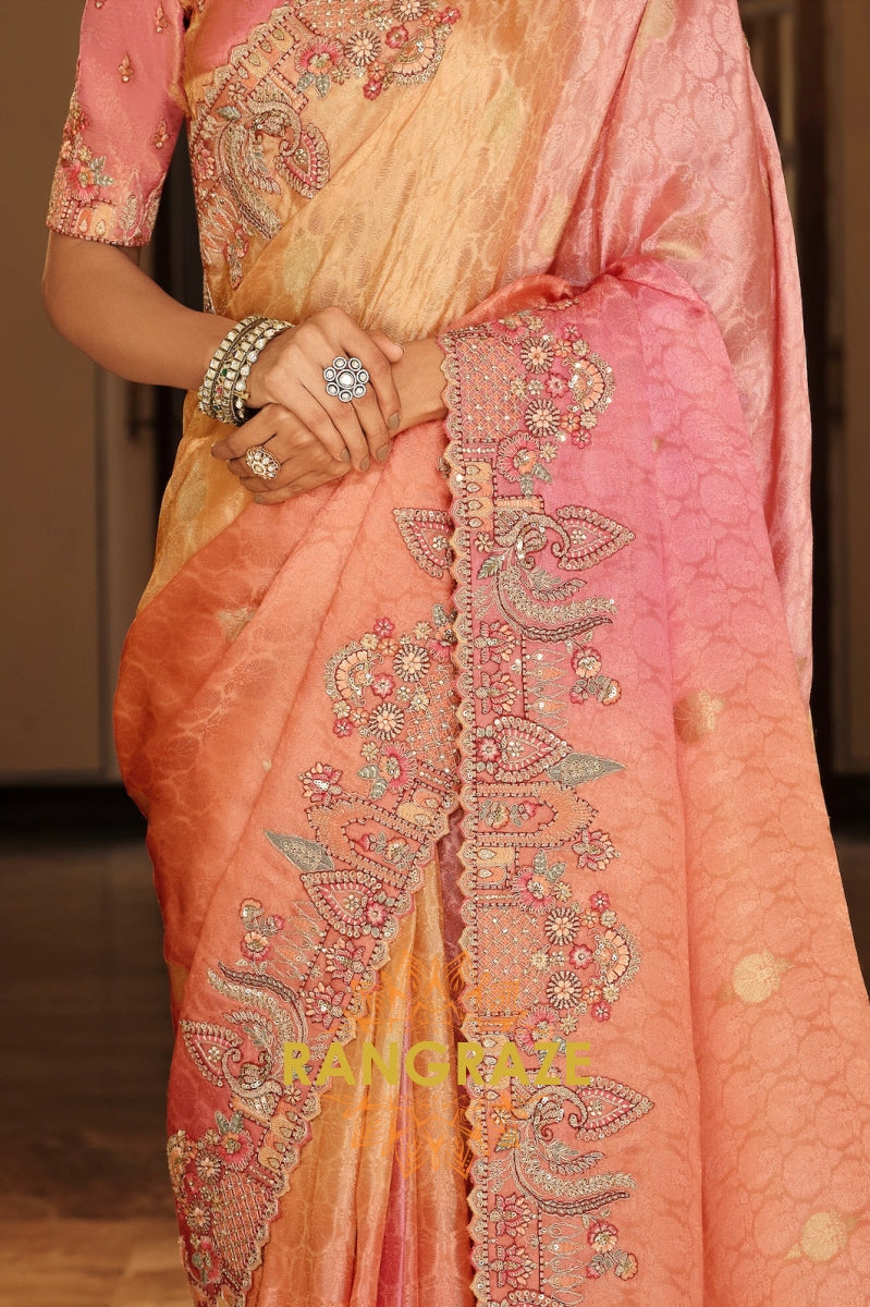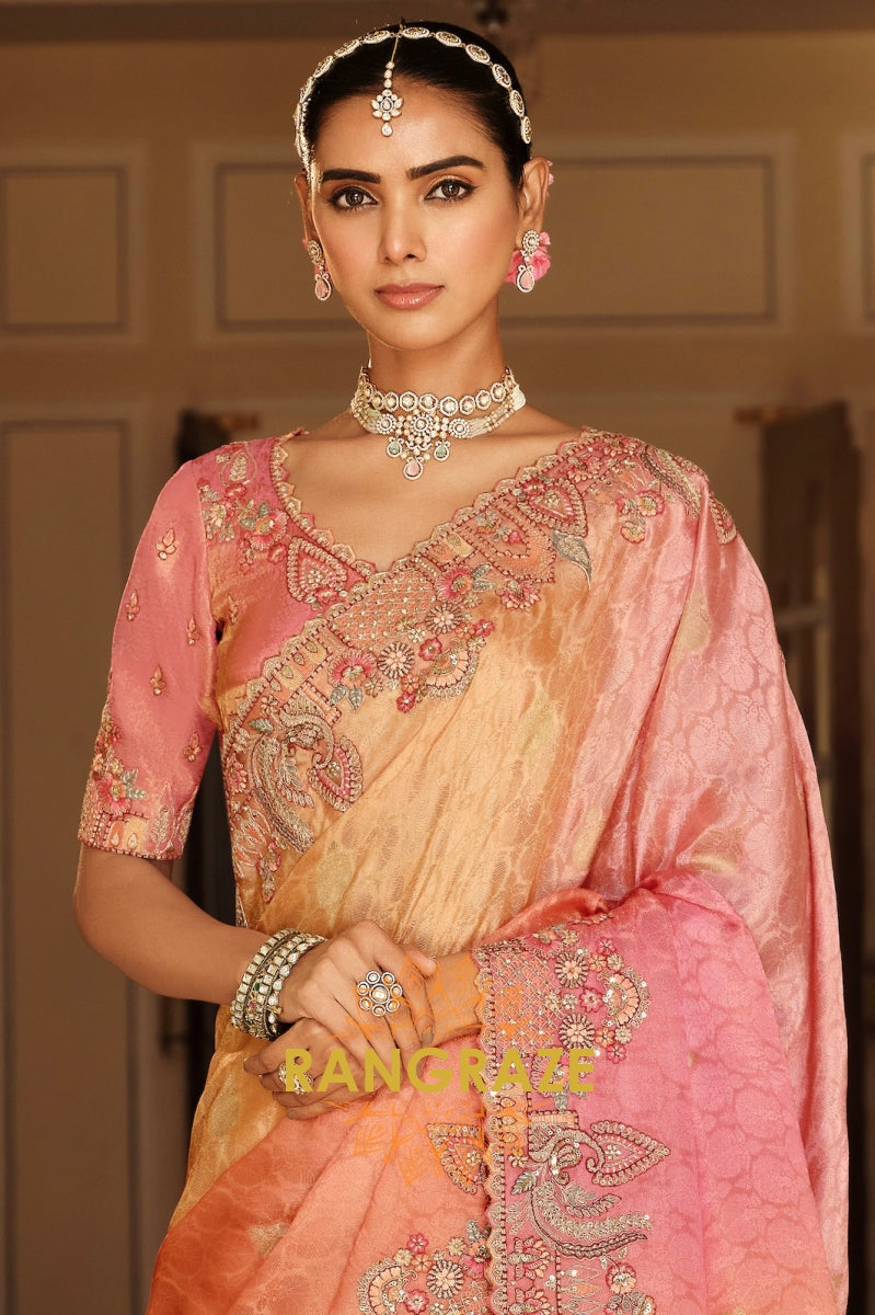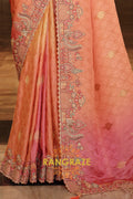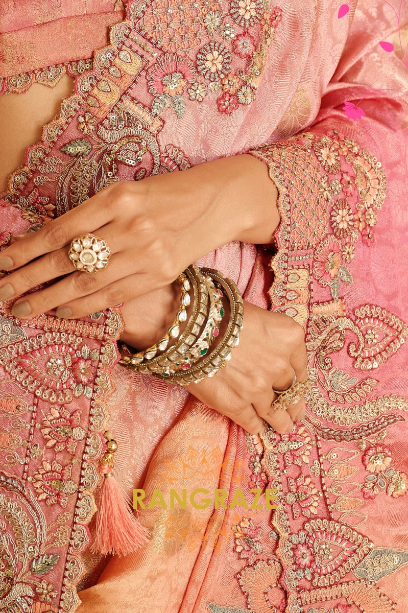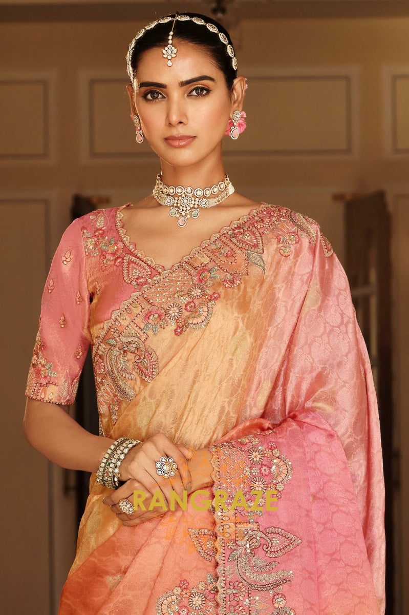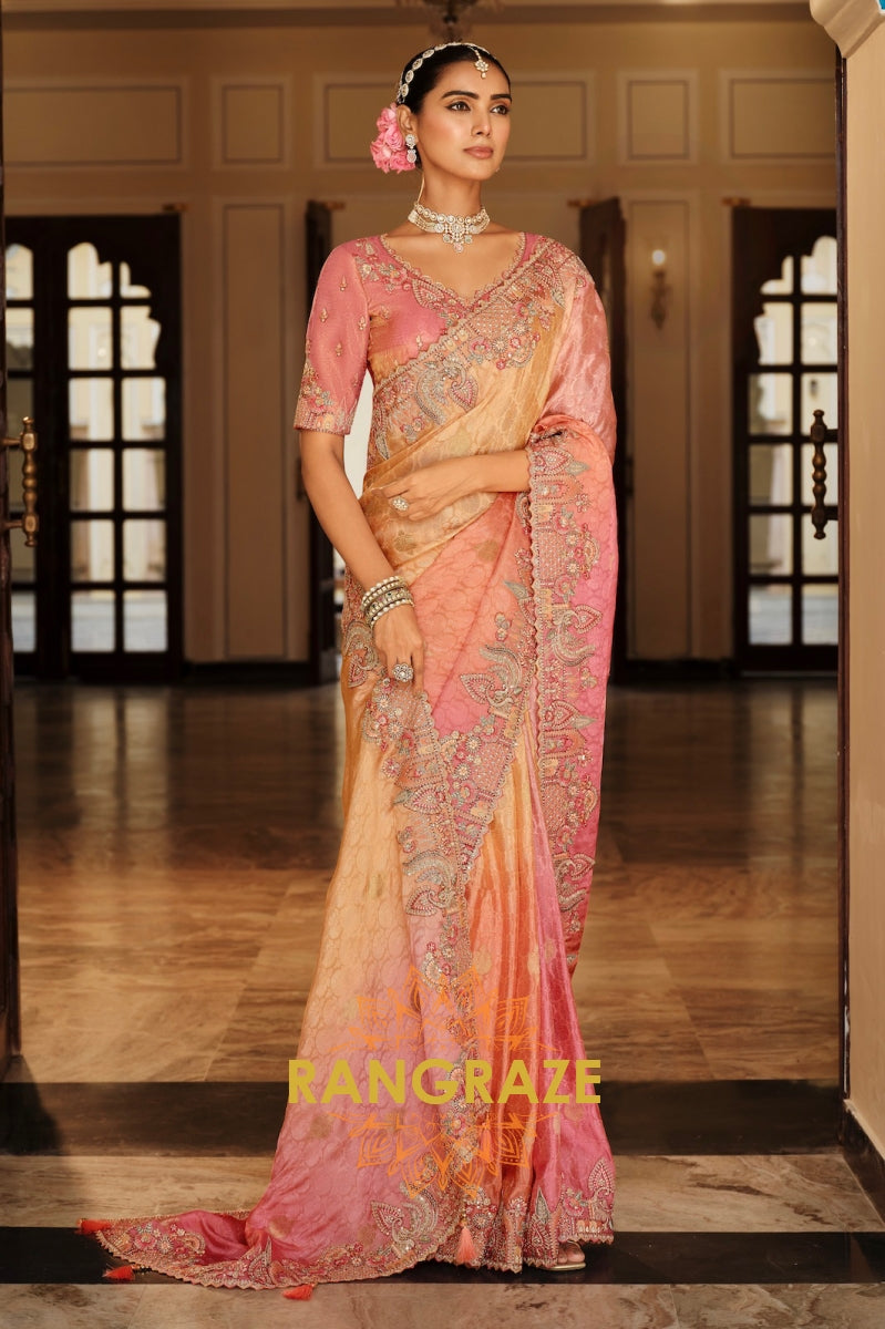 Immerse yourself in the radiance of tradition with the Blush Peach Elegance Designer Embroidered Silk Saree. This exquisite drape, in a captivating blend of peach and soft pink hues, is adorned with intricate embroidery featuring floral motifs, sequins, and shimmering threadwork that exude timeless charm.