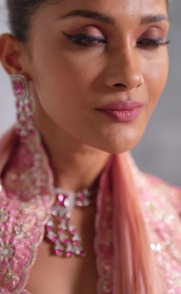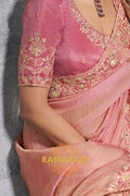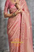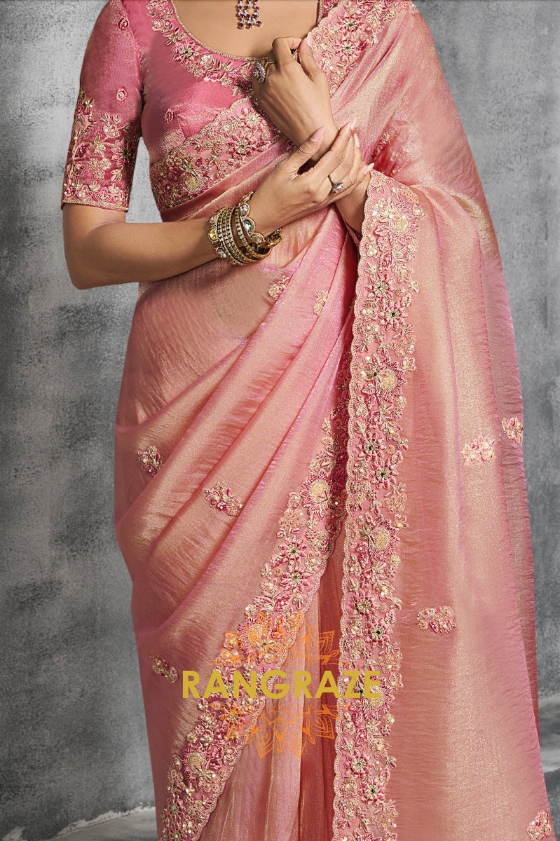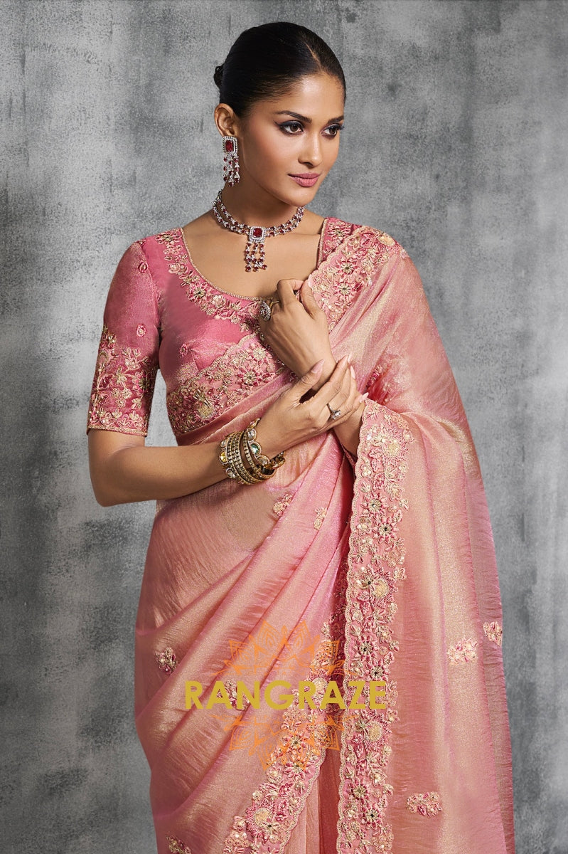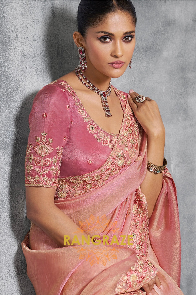 The blouse, in a matching blush pink shade, is heavily embroidered with intricate floral designs and resham detailing, complementing the saree to perfection. Its structured yet feminine silhouette enhances the regal appeal of the overall look.