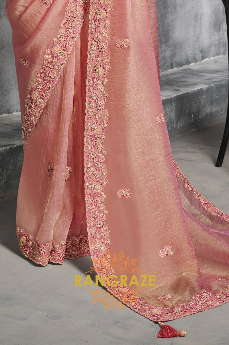Radiate sophistication with this Blush Pink Tissue Silk Saree, a masterpiece that exudes timeless charm. The soft tissue silk fabric glimmers with a delicate sheen, while the saree is adorned with exquisite resham, zari, and sequin embroidery. The floral motifs and scalloped embroidered border add richness and finesse, making it an ensemble that gracefully balances elegance with grandeur.