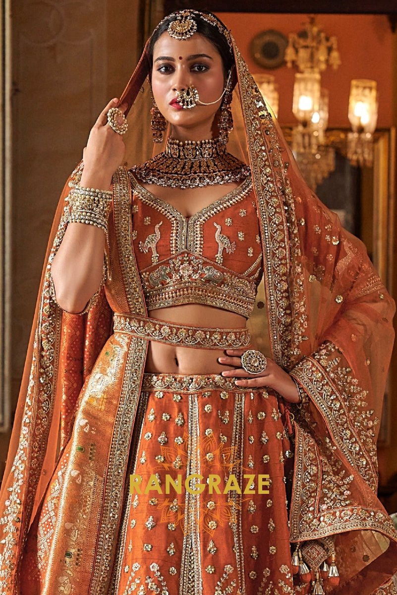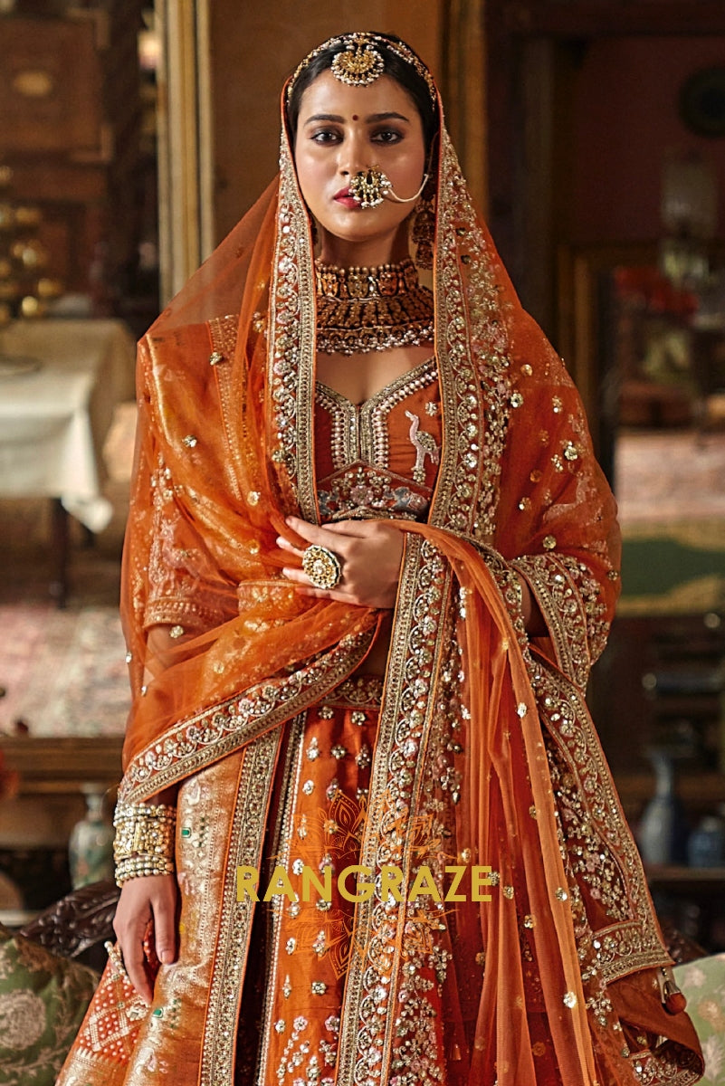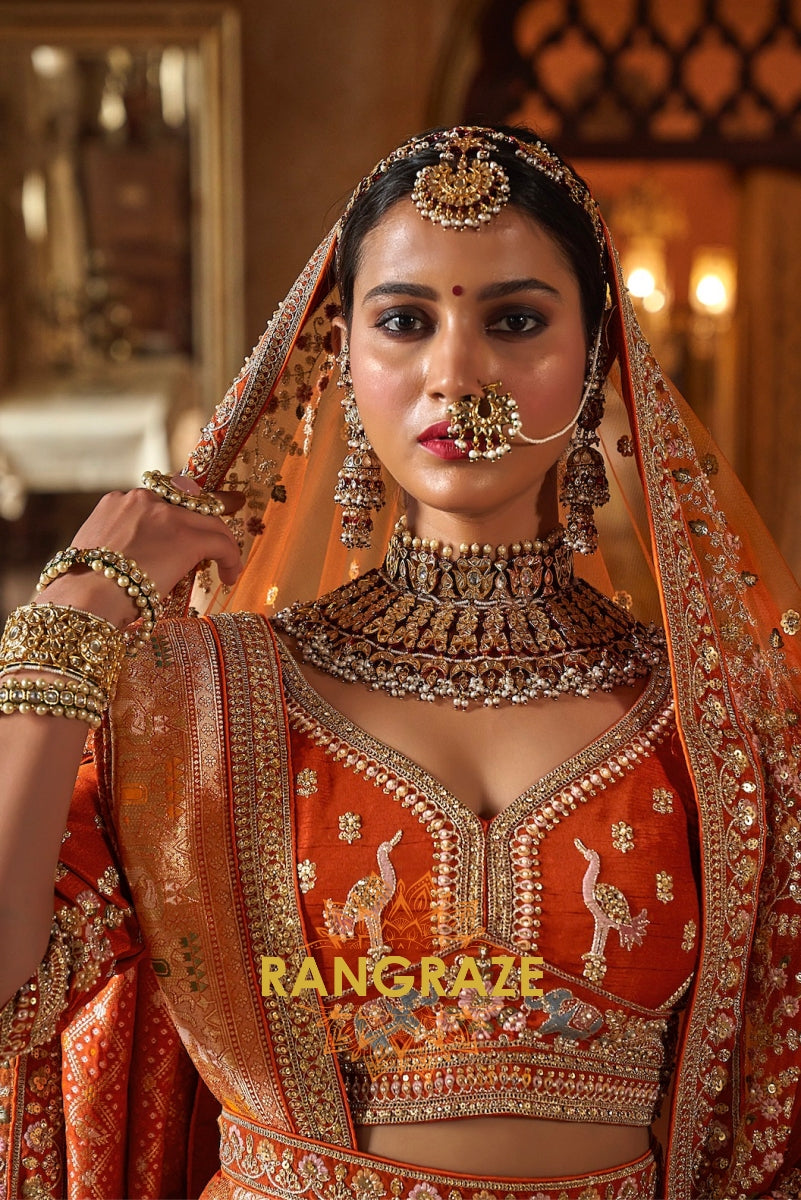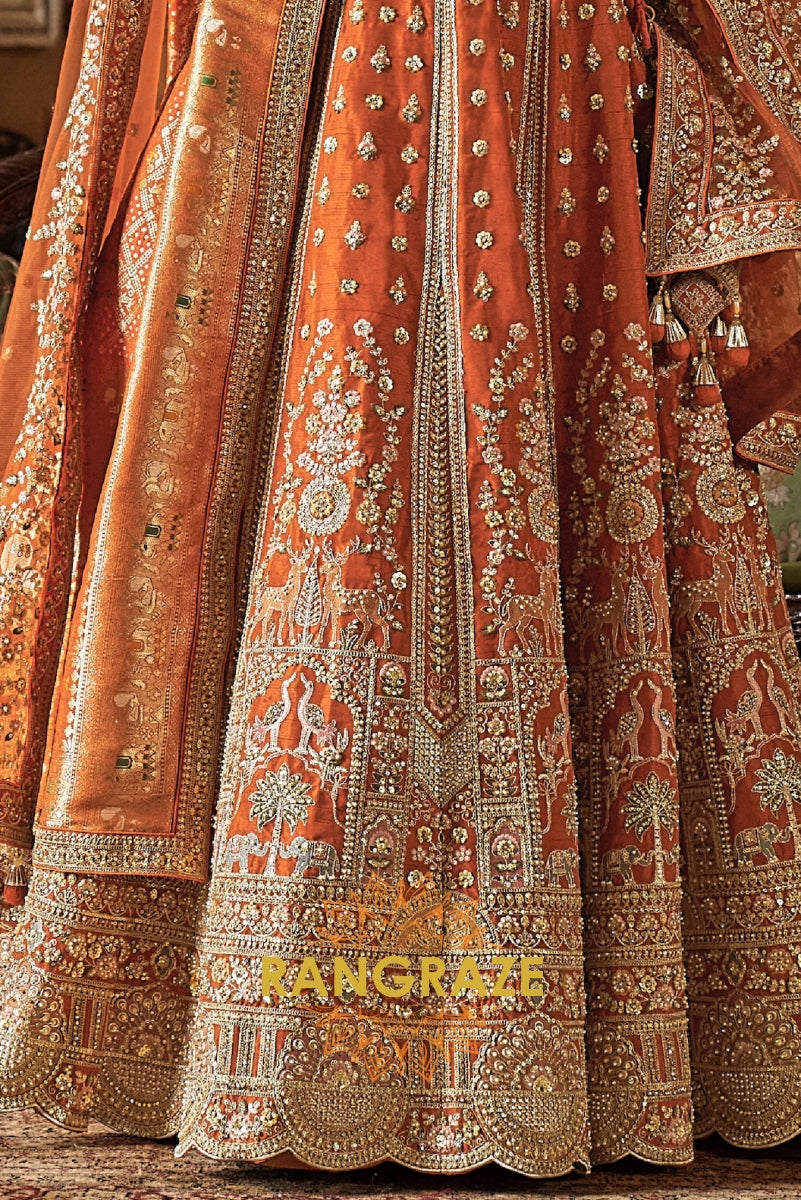 Embrace the grandeur of heritage artistry with the Burnt Amber Heritage Bridal Silk Lehenga, a timeless creation inspired by Sabyasachi’s signature aesthetic. Crafted for the bride who values both tradition and individuality, this lehenga is a poetic blend of royal symbolism and exquisite craftsmanship.