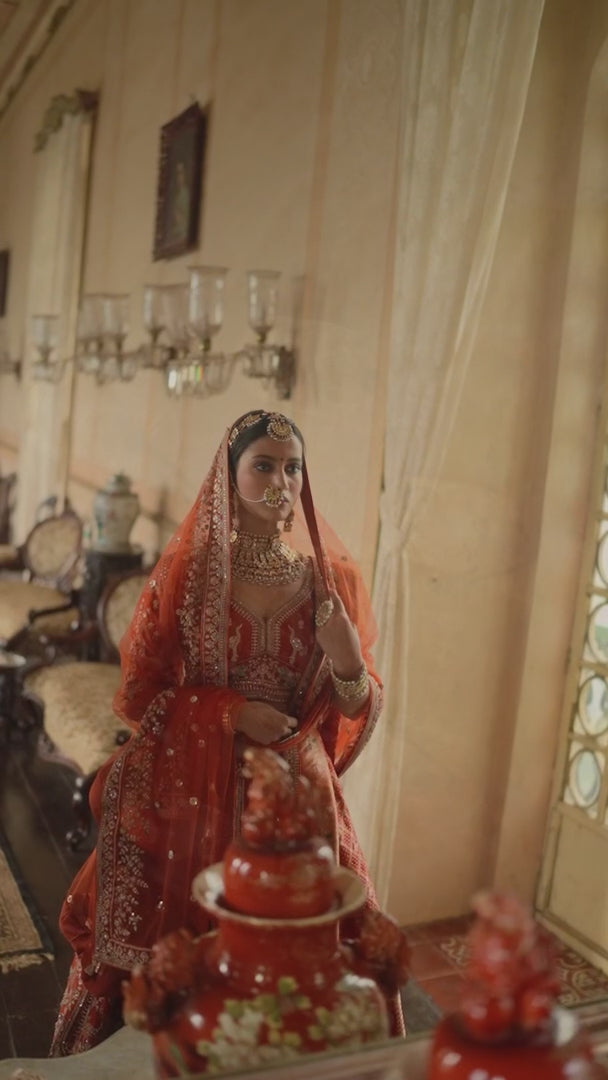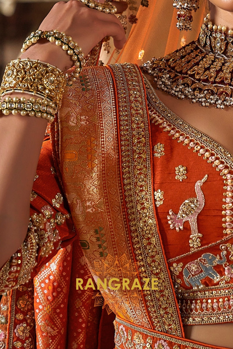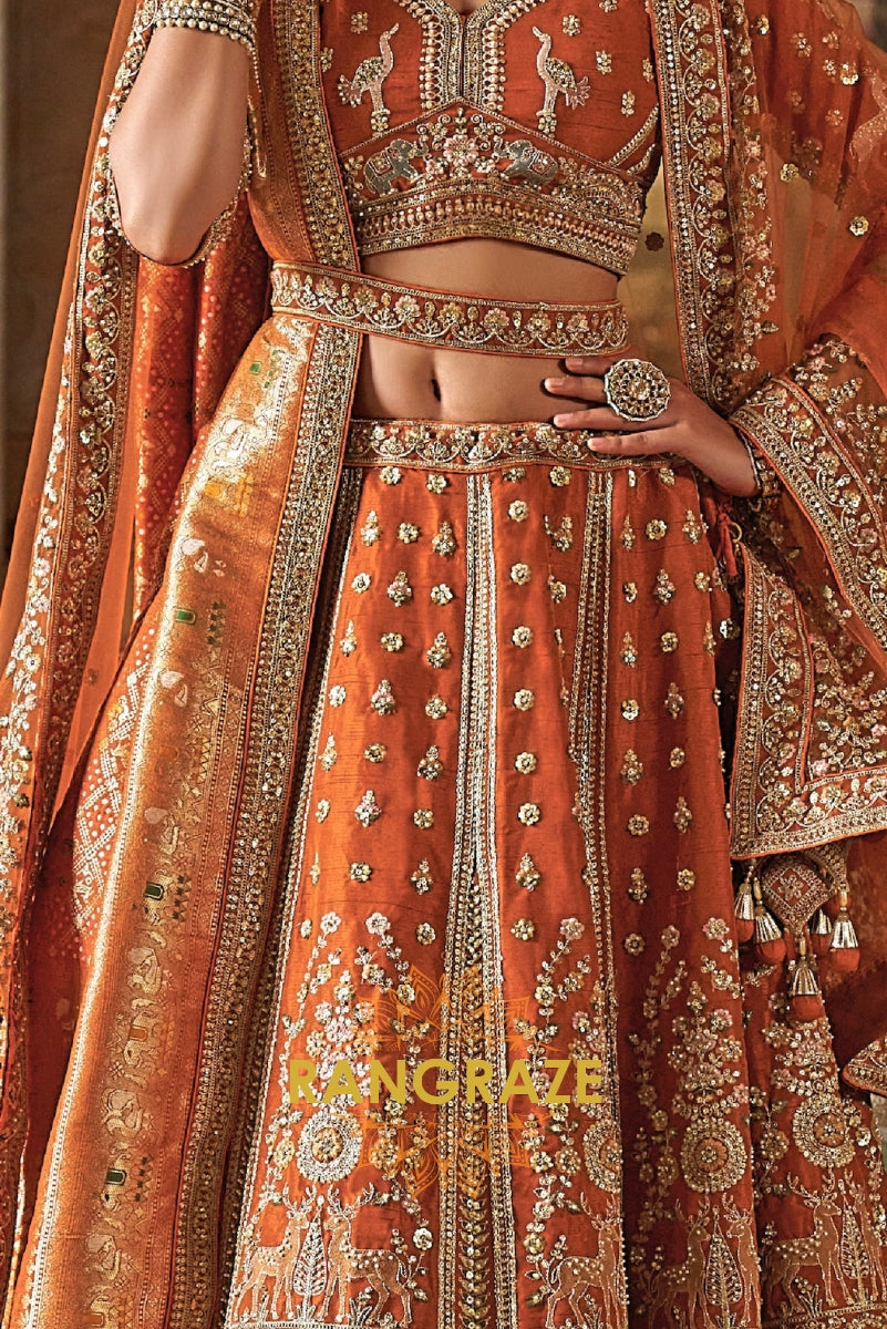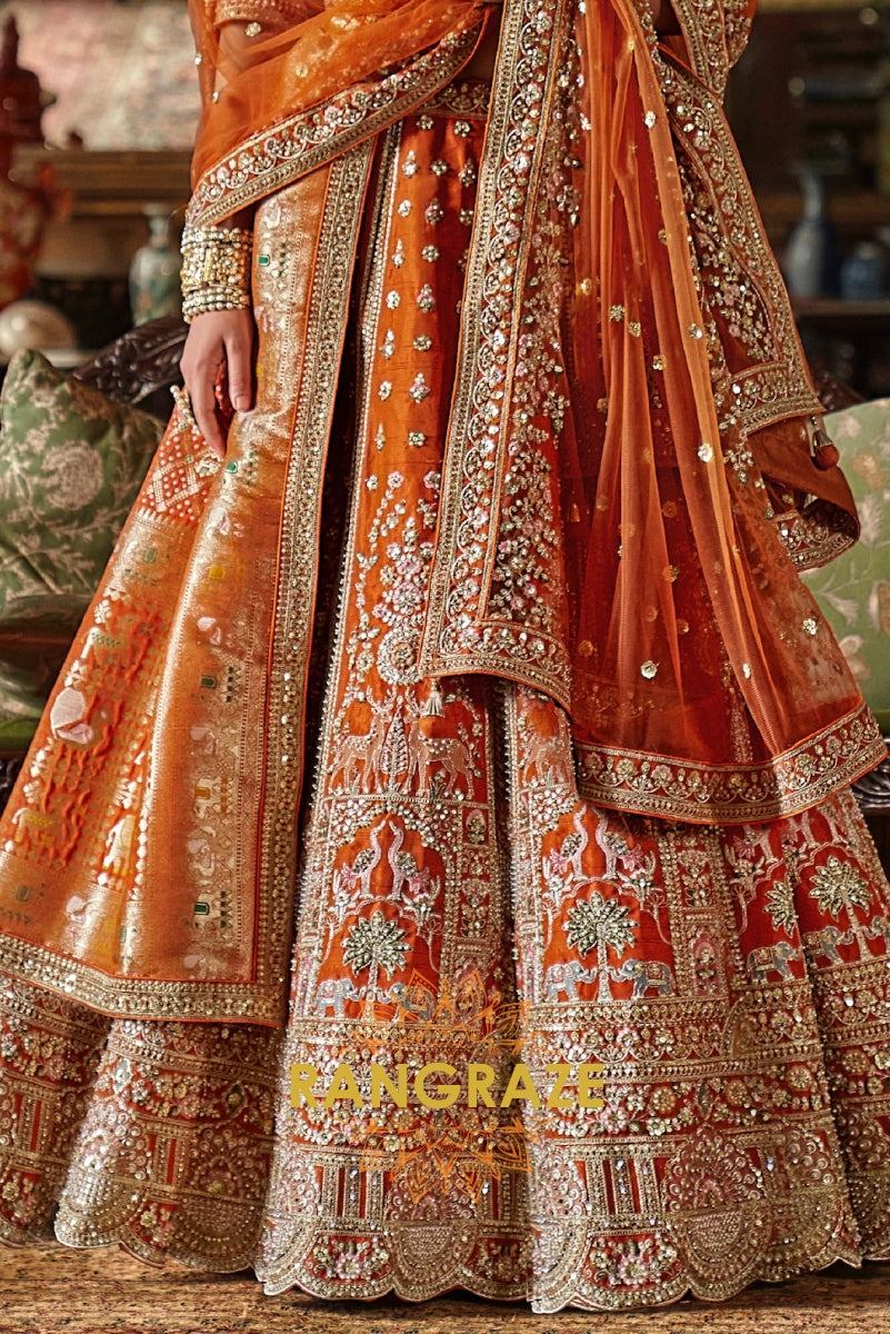 Embrace the grandeur of heritage artistry with the Burnt Amber Heritage Bridal Silk Lehenga, a timeless creation inspired by Sabyasachi’s signature aesthetic. Crafted for the bride who values both tradition and individuality, this lehenga is a poetic blend of royal symbolism and exquisite craftsmanship.