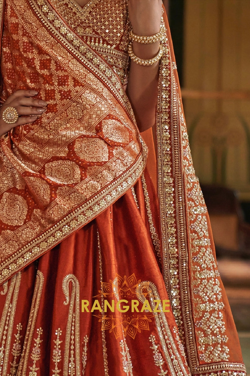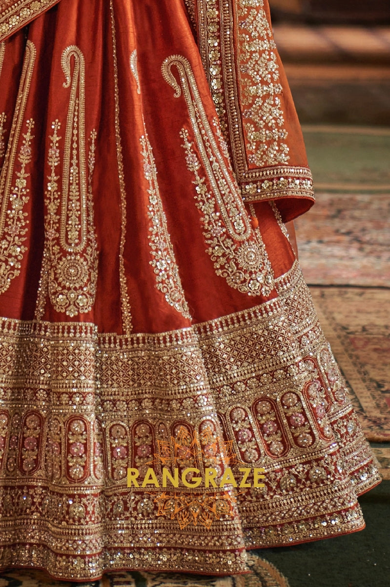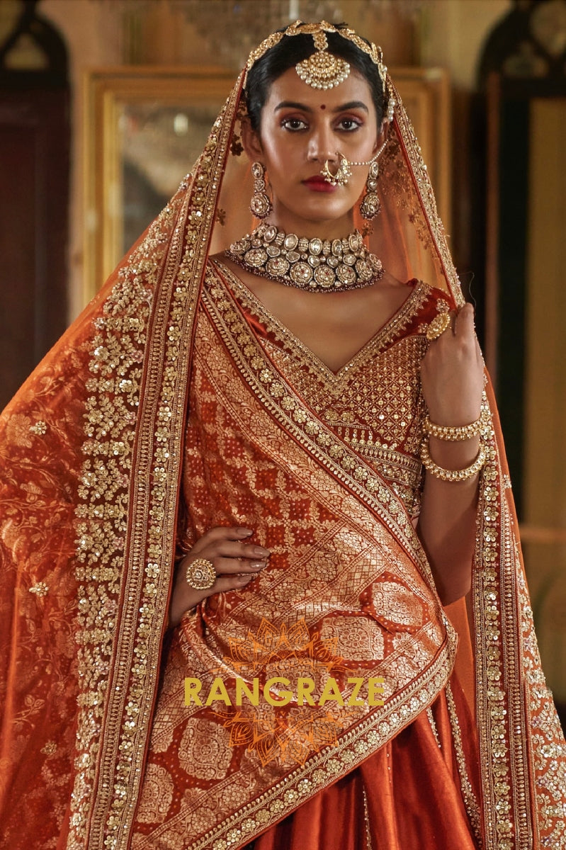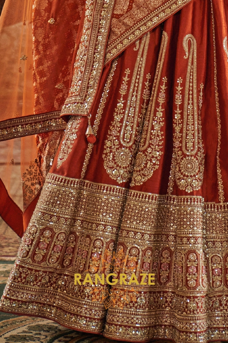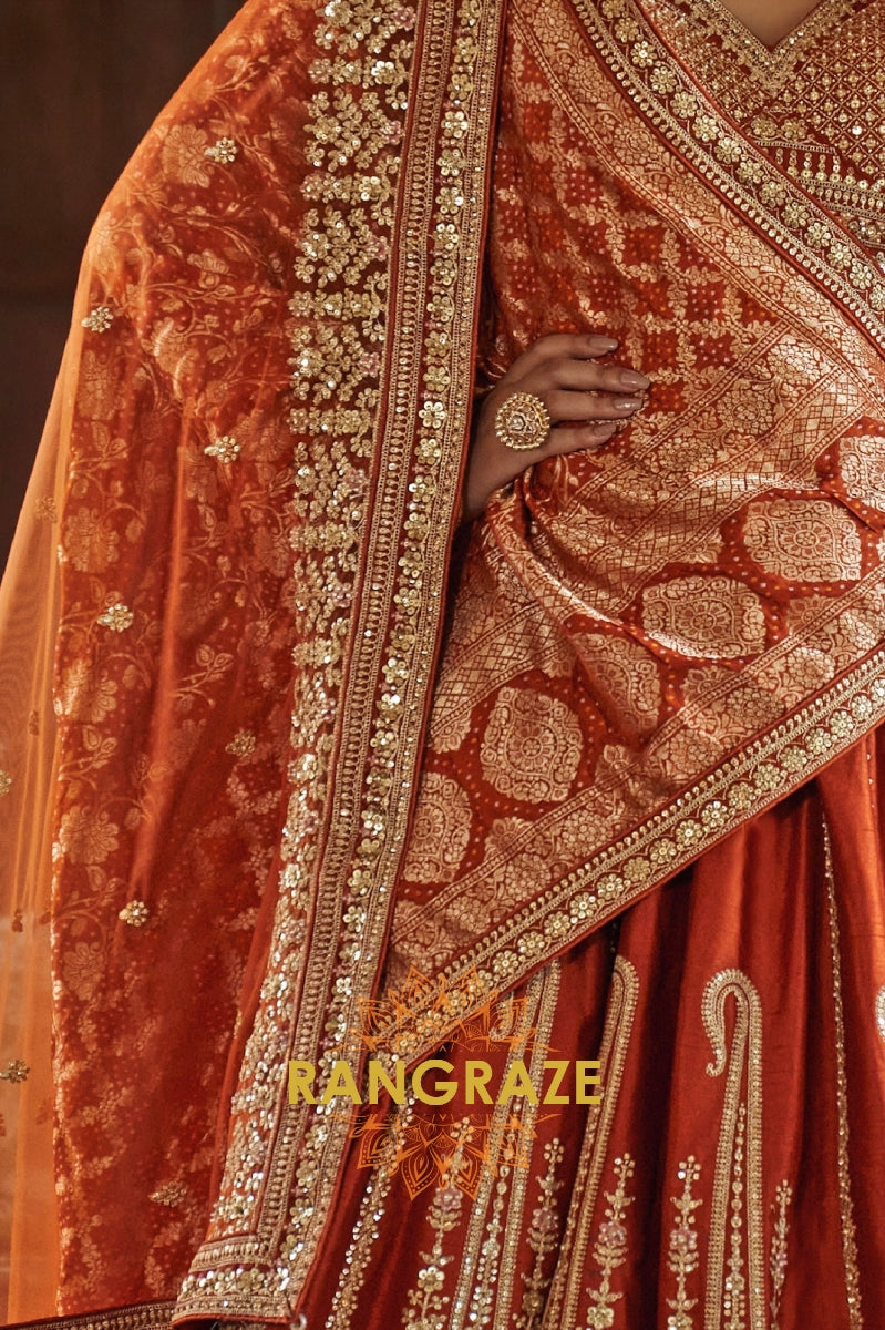 Step into timeless elegance with the Burnt Orange Rust Double-Dupatta Bridal Silk Lehenga, an exquisite creation inspired by Sabyasachi’s signature royal artistry. Designed for the modern bride who cherishes heritage while embracing sophistication, this lehenga embodies regal charm and cultural legacy.