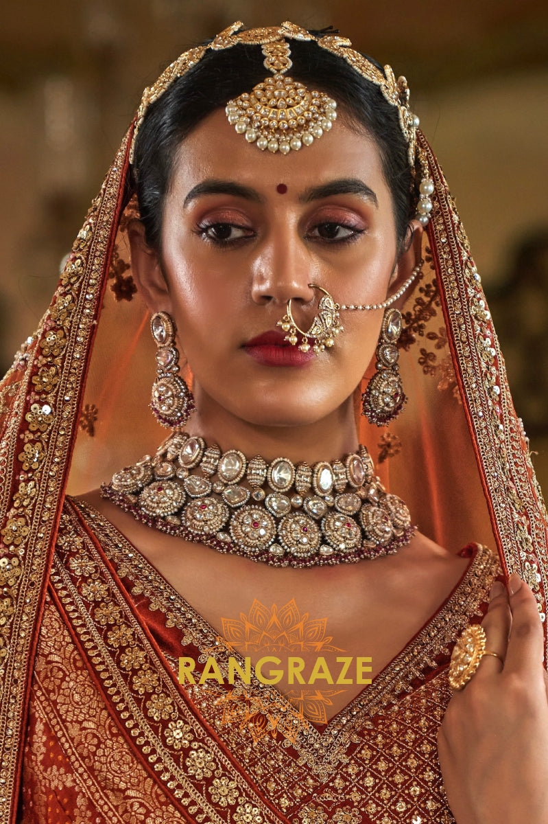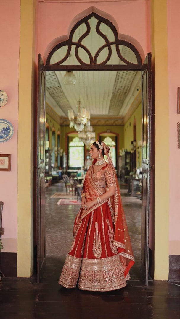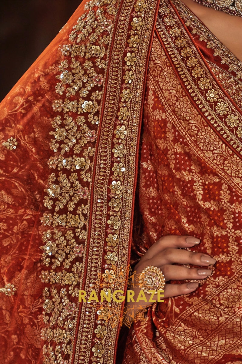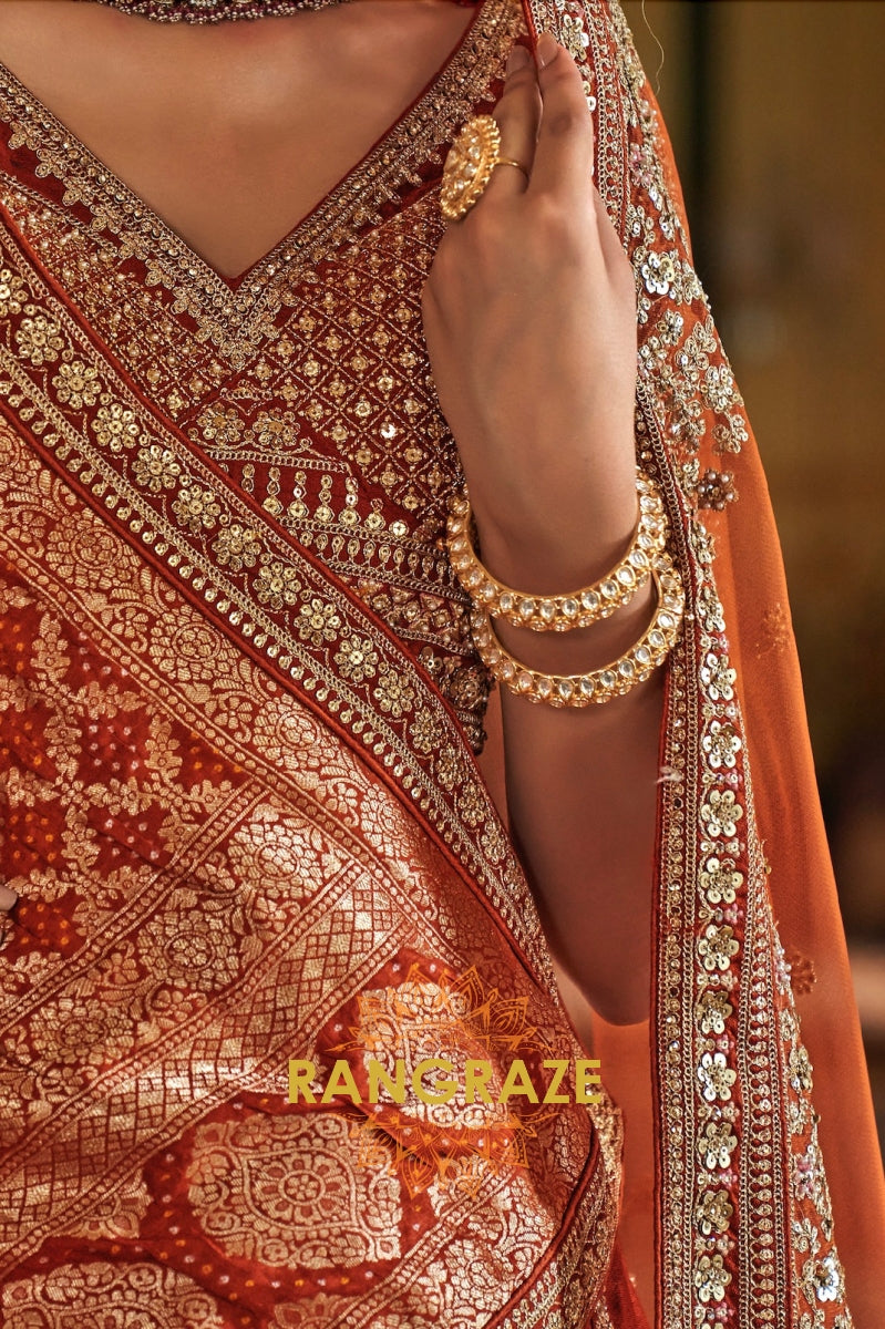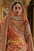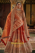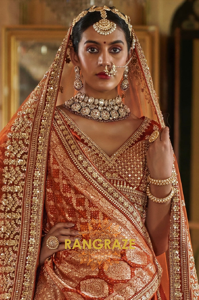 Step into timeless elegance with the Burnt Orange Rust Double-Dupatta Bridal Silk Lehenga, an exquisite creation inspired by Sabyasachi’s signature royal artistry. Designed for the modern bride who cherishes heritage while embracing sophistication, this lehenga embodies regal charm and cultural legacy.