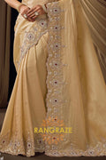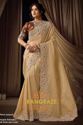 Elevate your ethnic wardrobe with the timeless elegance of this Champagne Gold Satin Silk Embroidered Saree from RangRaze. Designed for sophistication and grandeur, this saree features a luxurious satin silk base with a subtle jacquard texture that enhances its rich and graceful drape.
