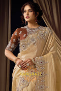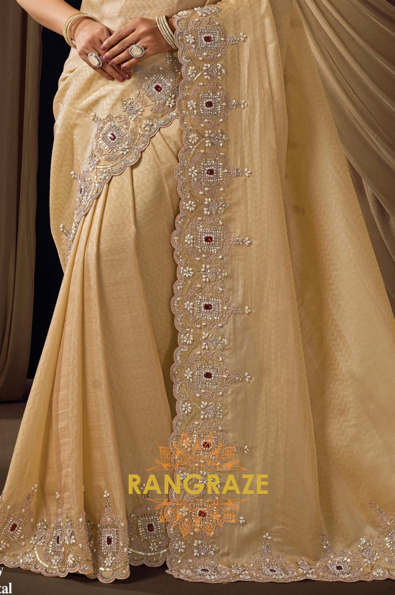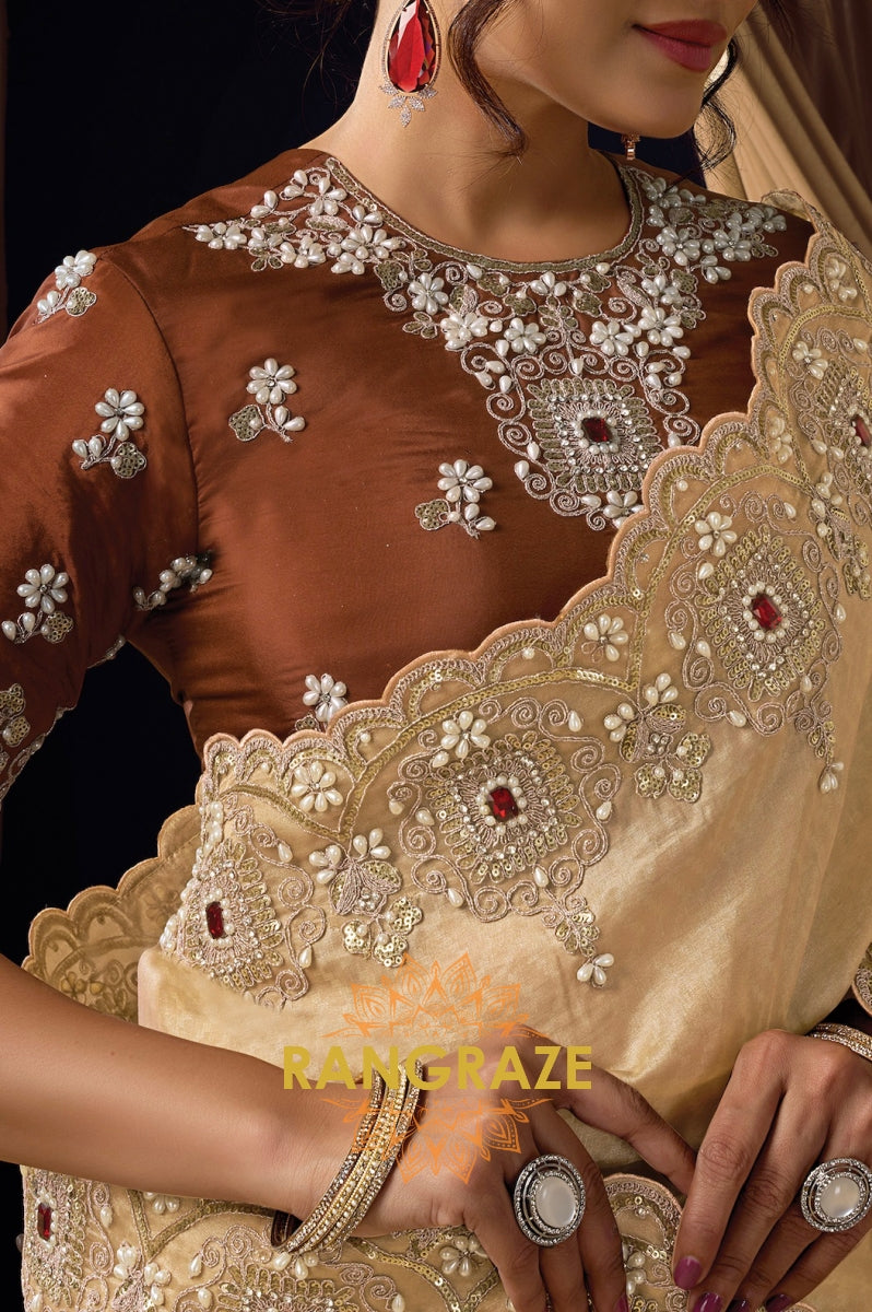 Adorned with intricate sequins embroidery highlighted by delicate pearl and crystal embellishments, the saree showcases an opulent scalloped border and finely detailed pallu. The ensemble is beautifully complemented by a contrasting brown embroidered blouse, adding depth and regal charm. Perfect for weddings, receptions, engagements, and festive celebrations, this saree embodies refined luxury and modern royalty.