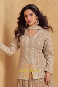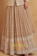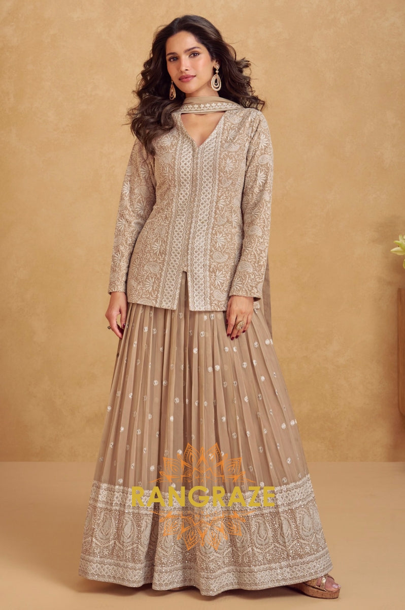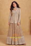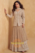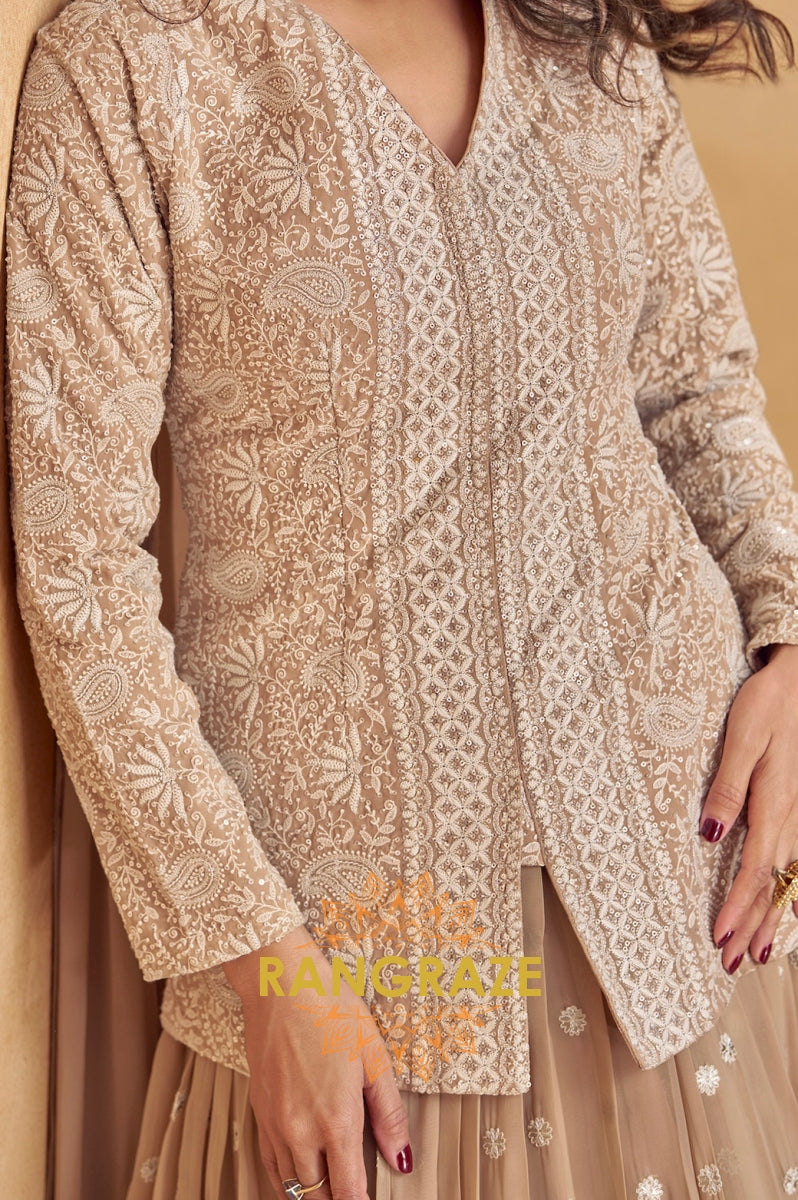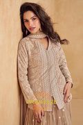 A celebration of finesse and structure, the Champagne Glow Embroidered Jacket Lehenga Set is where contemporary tailoring meets classic embroidery. This three-piece set features a sophisticated, long-line front-slit jacket heavily adorned with tonal thread and sequin work in floral, paisley, and geometric motifs. Rendered in a soft nude-champagne hue, the ensemble glows with understated luxury.
