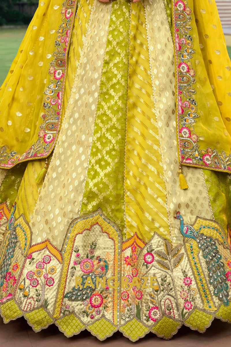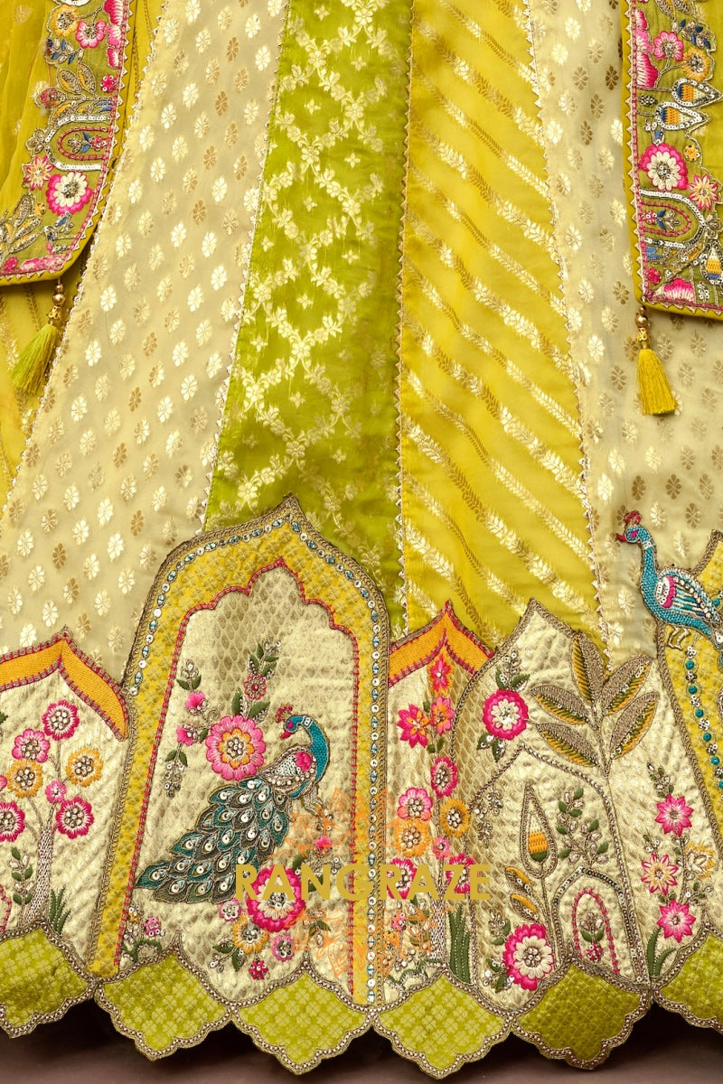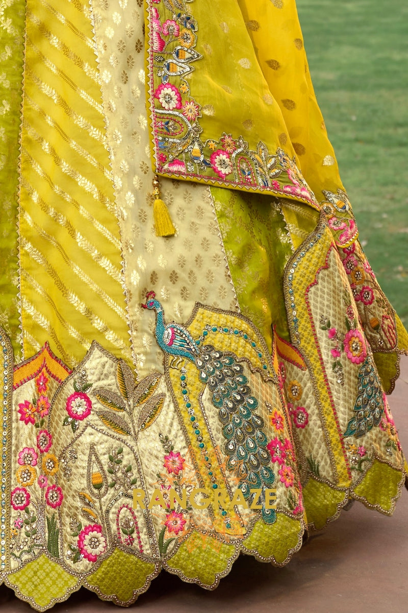 Crafted in a striking chartreuse green and soft ivory palette, the lehenga features intricate floral and heritage-inspired motifs arranged in beautifully structured panels. Detailed embroidery using resham, zari, sequins, stone, and subtle mirror work adds depth and artisanal richness throughout. The heavily embroidered scalloped hem enhances its grandeur, while the expansive 4.2-meter ghera ensures a majestic, flowing silhouette with every twirl.