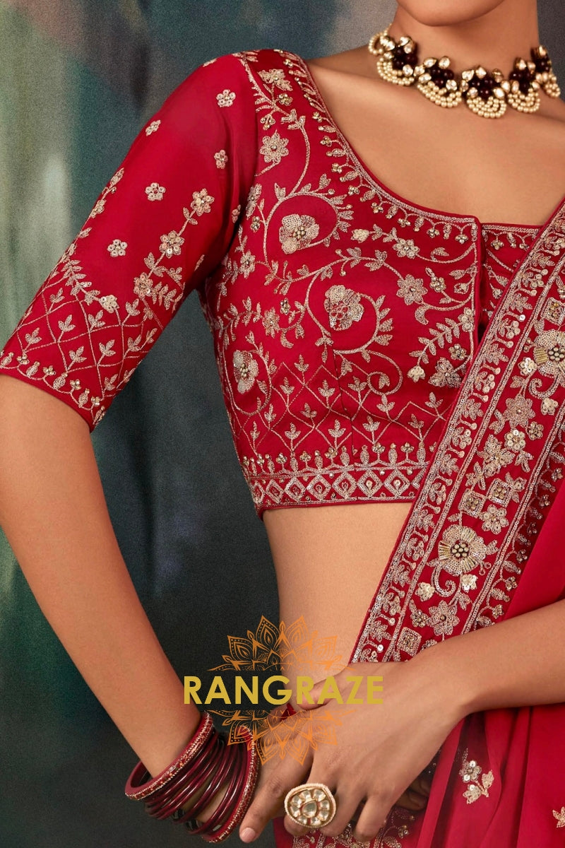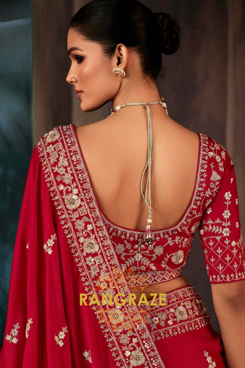Crafted in a luxurious premium silky fabric, this deep crimson red saree is beautifully adorned with elegant all-over embroidery inspired by classic floral and traditional motifs. The intricate handwork features fine zari, resham, sequins, and subtle stone embellishments, lending the saree a rich texture and graceful sheen. The heavily embroidered pallu and finely detailed border stand out as the focal points, adding depth and opulence to the fluid drape.