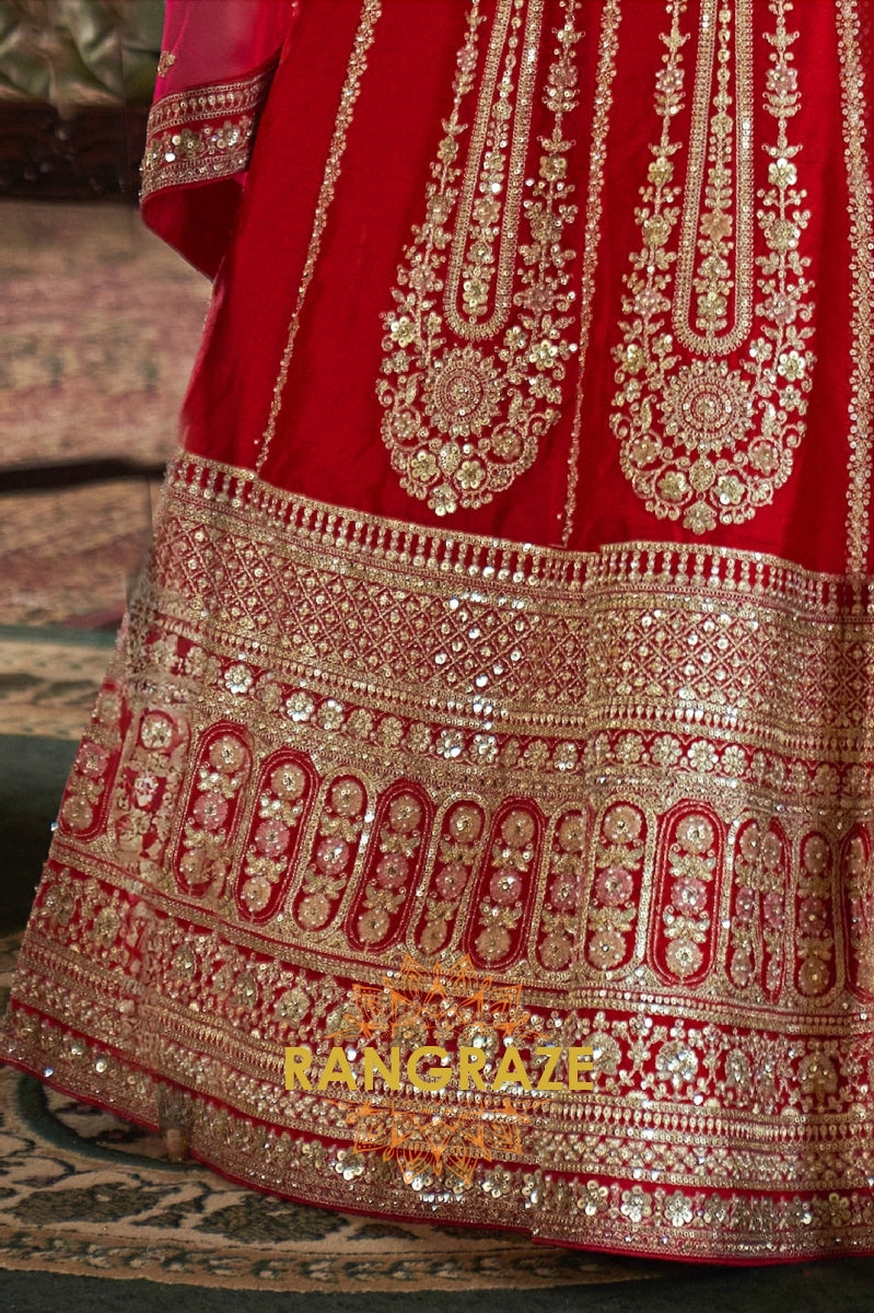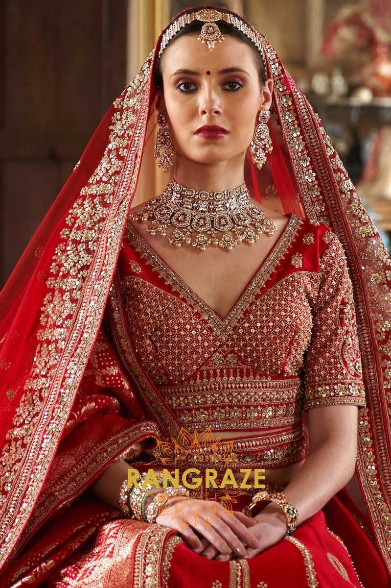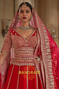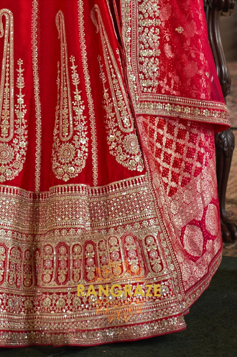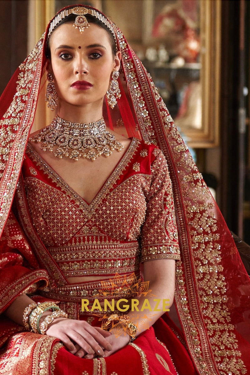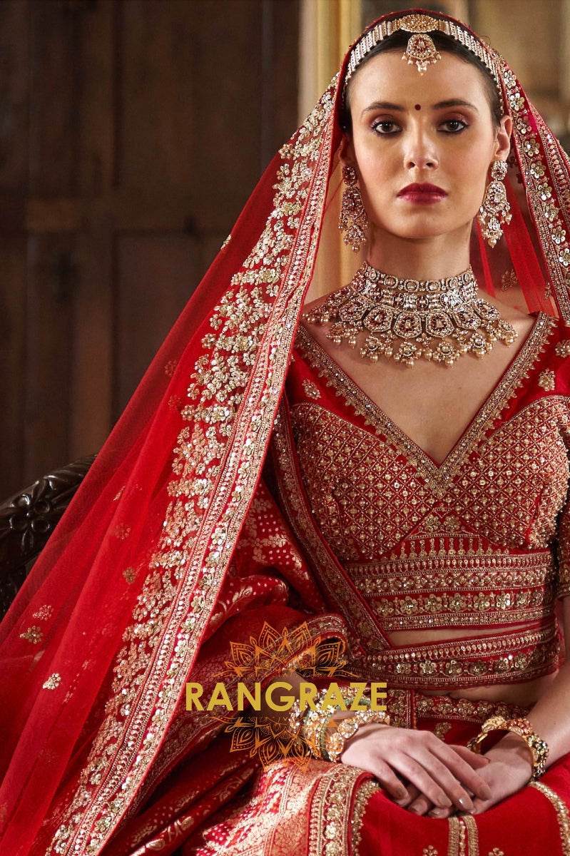 Step into timeless elegance with the Crimson Red Double-Dupatta Bridal Silk Lehenga, an exquisite creation inspired by Sabyasachi’s signature artistry. With its bold crimson hue and distinctive embroidery pattern, this lehenga is designed for the modern bride who cherishes tradition while embracing her individuality.