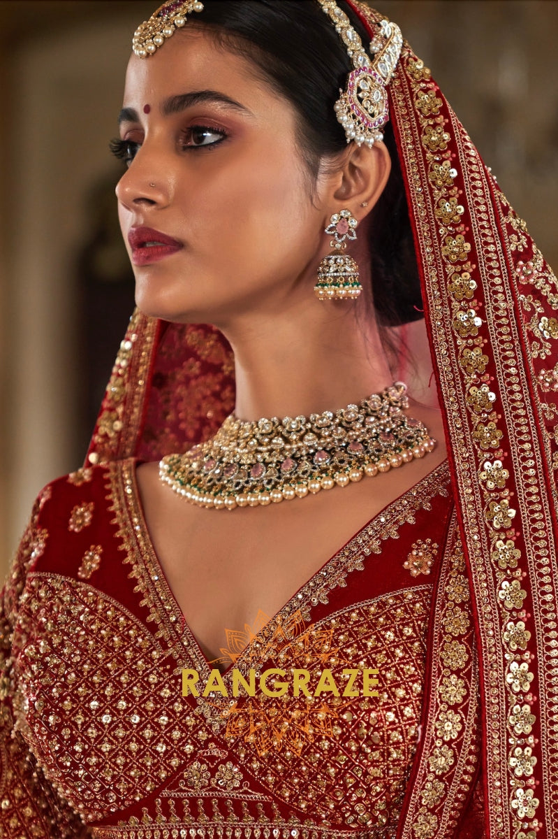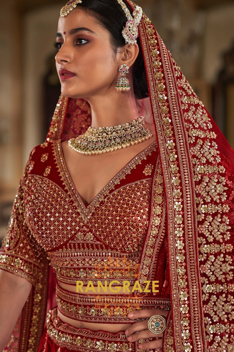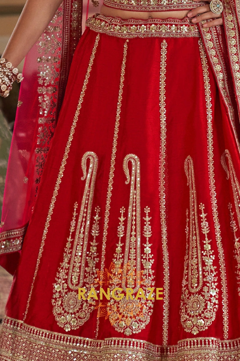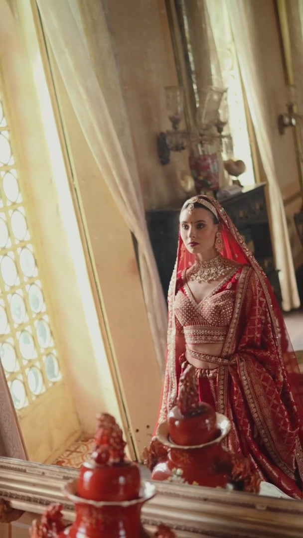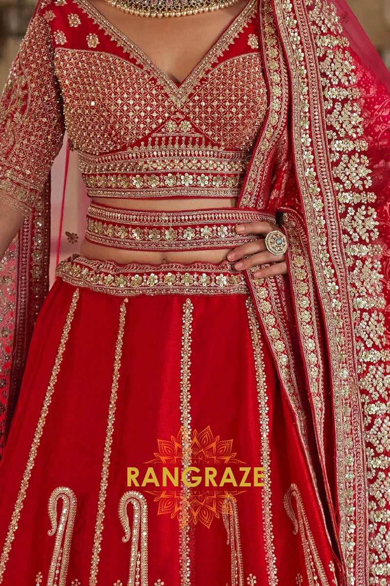 Step into timeless elegance with the Crimson Red Double-Dupatta Bridal Silk Lehenga, an exquisite creation inspired by Sabyasachi’s signature artistry. With its bold crimson hue and distinctive embroidery pattern, this lehenga is designed for the modern bride who cherishes tradition while embracing her individuality.