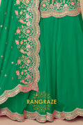 The deep emerald green hue exudes royalty, making it a perfect choice for weddings, festive celebrations, mehendi functions, sangeet nights, and grand gatherings.