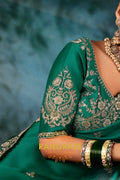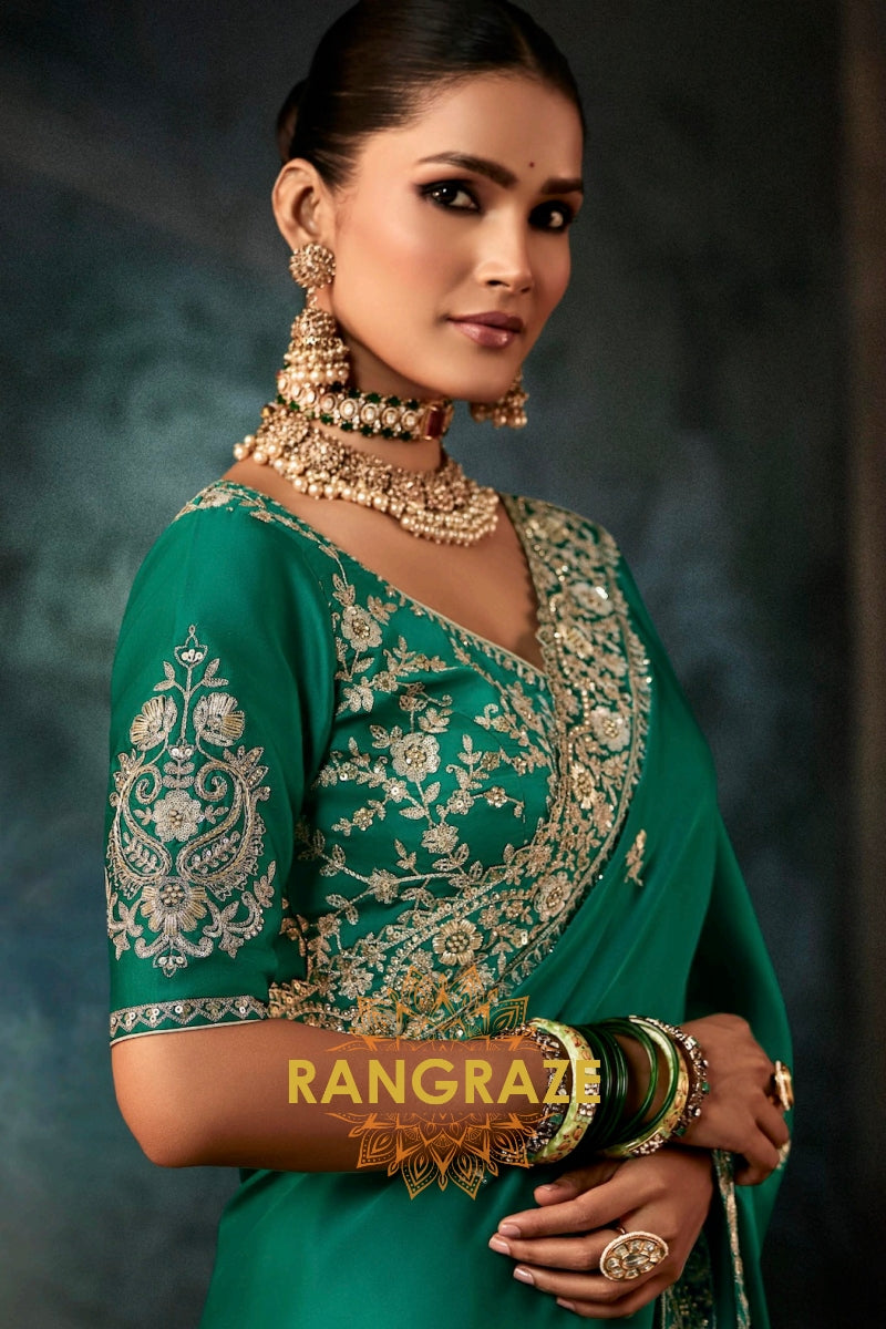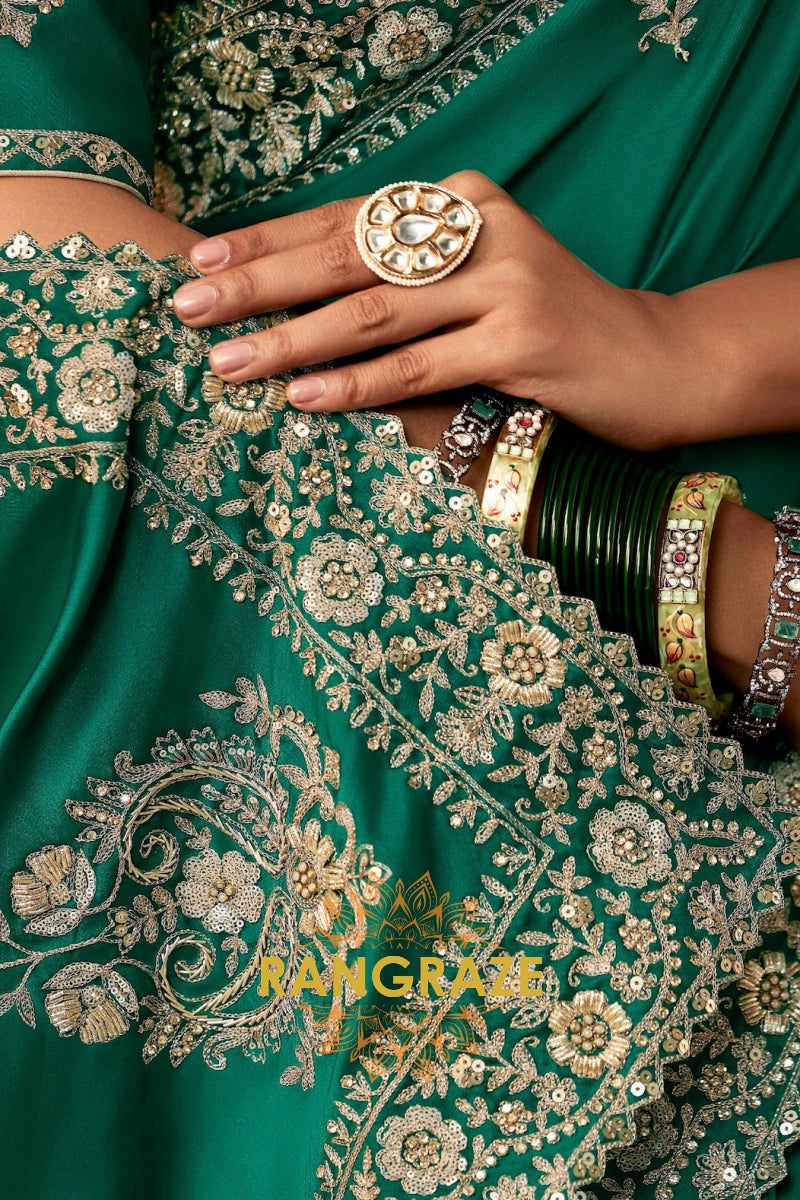 Drape yourself in timeless grandeur with this Emerald Green Designer Embroidered Saree, a statement ensemble that embodies regal elegance and meticulous craftsmanship, perfect for weddings, receptions, and high-profile celebrations.