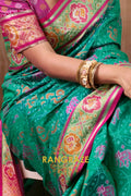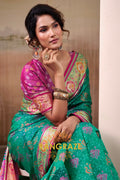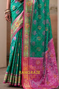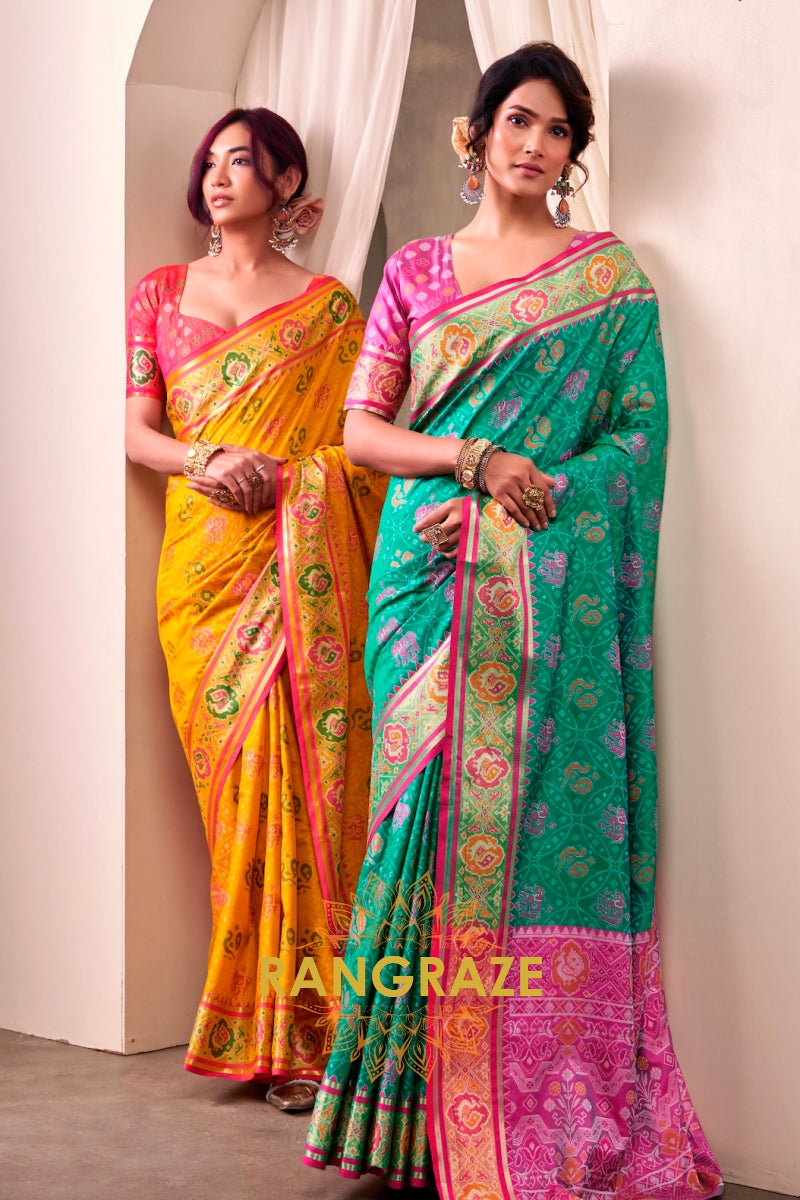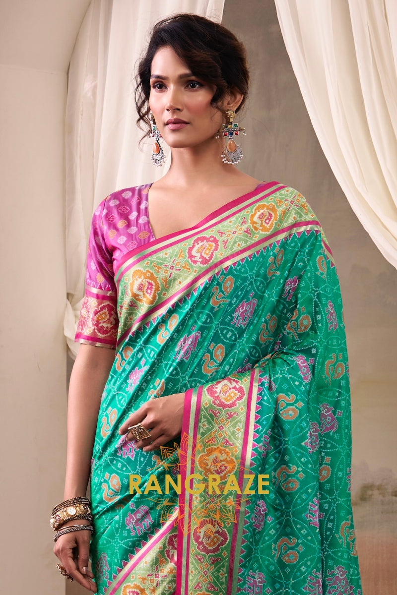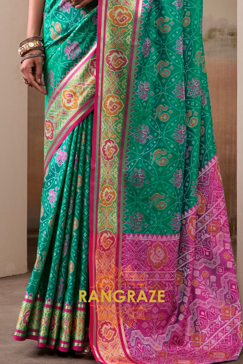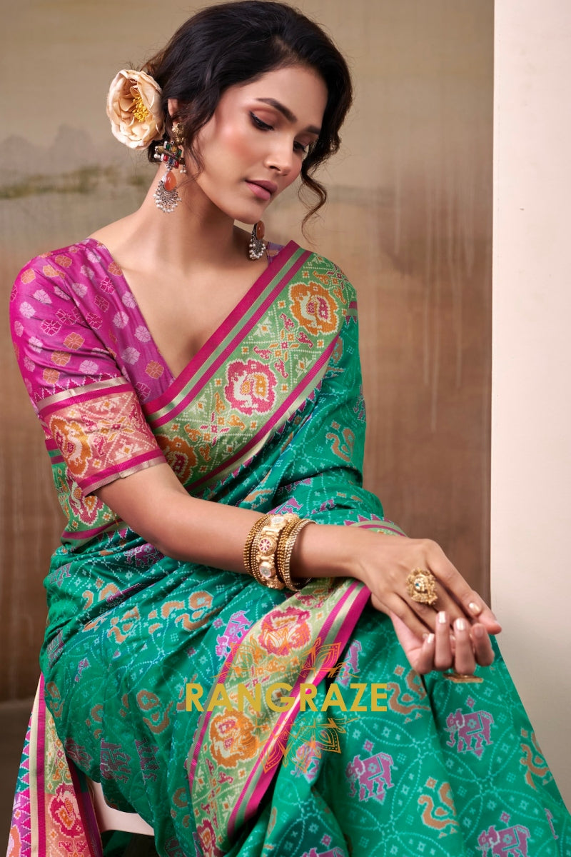 Step into a celebration of colors with the Emerald Bloom & Fuchsia Patola Silk Saree, a breathtaking ensemble that captures the essence of traditional elegance. Crafted from premium silk, this saree features a vivid emerald green base adorned with intricate motifs in shades of pink, orange, and gold. The striking fuchsia pallu and blouse are enriched with delicate zari work and floral accents, creating a stunning contrast against the lush green body.