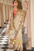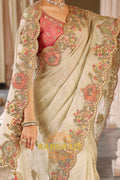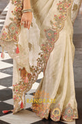 Step into ethereal grace with the Enchanted Blossom Glow Designer Embroidered Silk Saree. Crafted in a soft ivory-cream tissue base, this masterpiece radiates sheer sophistication. The saree is adorned with intricate floral embroidery in pastel hues, enriched with resham and zari threadwork, delicate sequins, and shimmering highlights that create an enchanting aura.